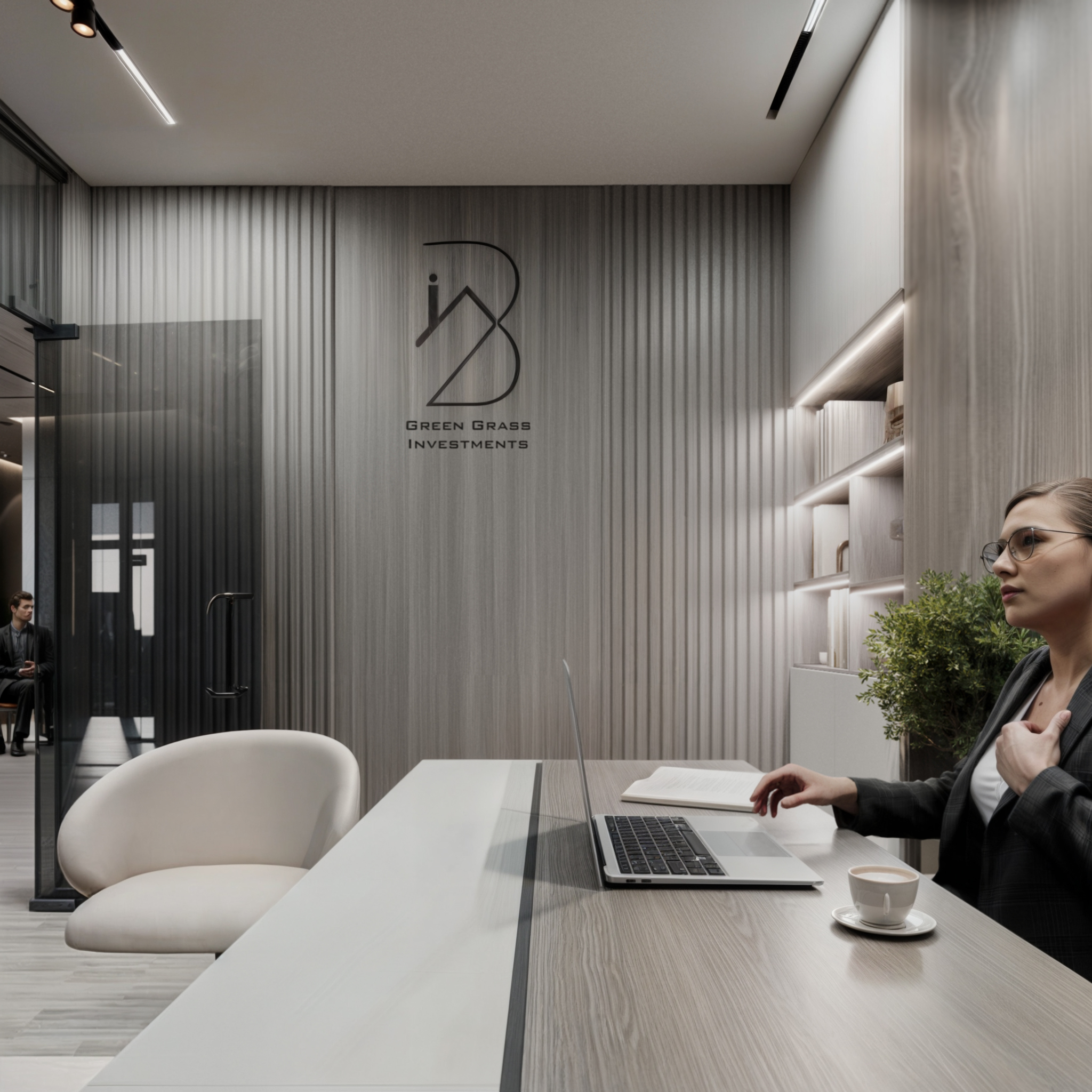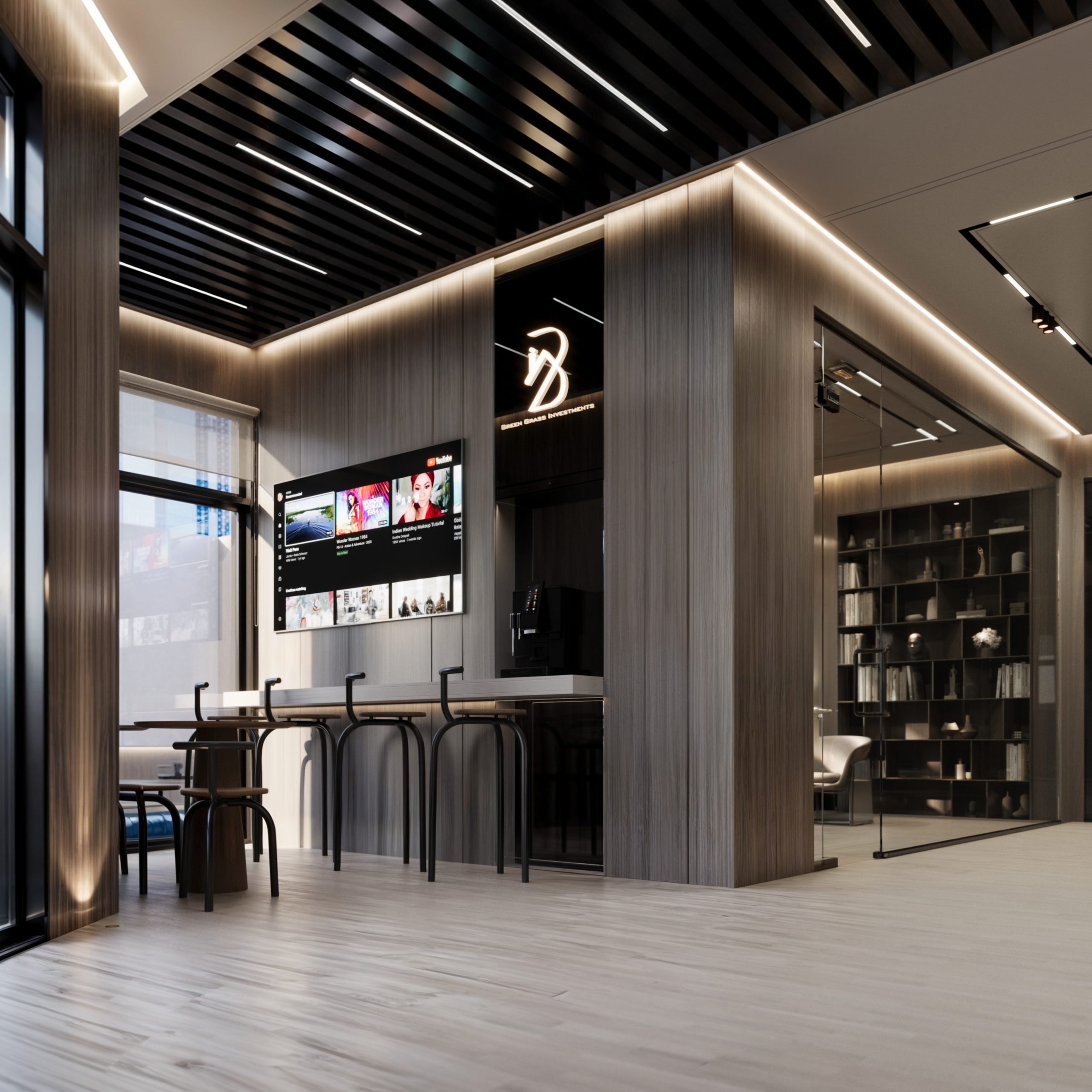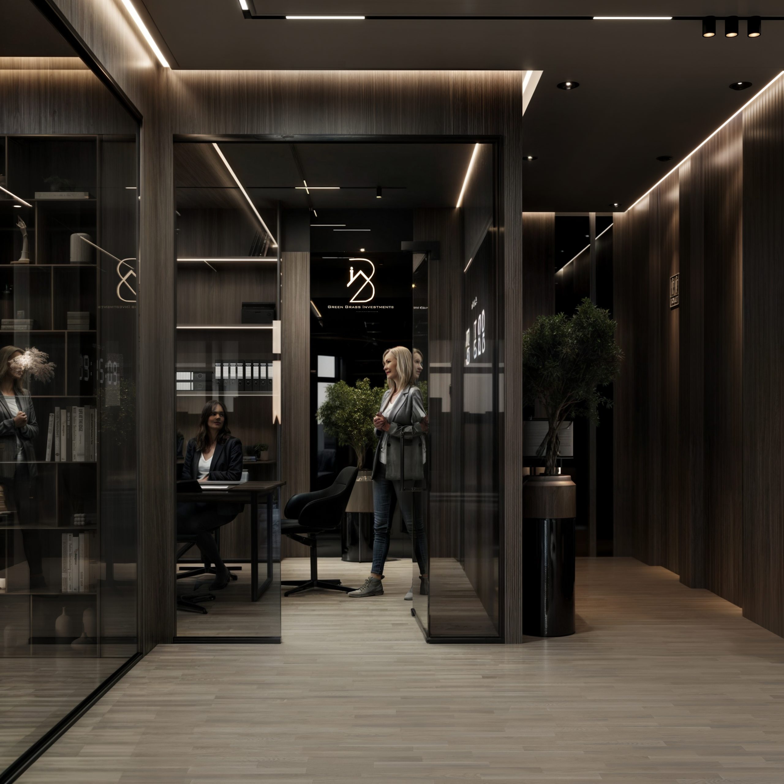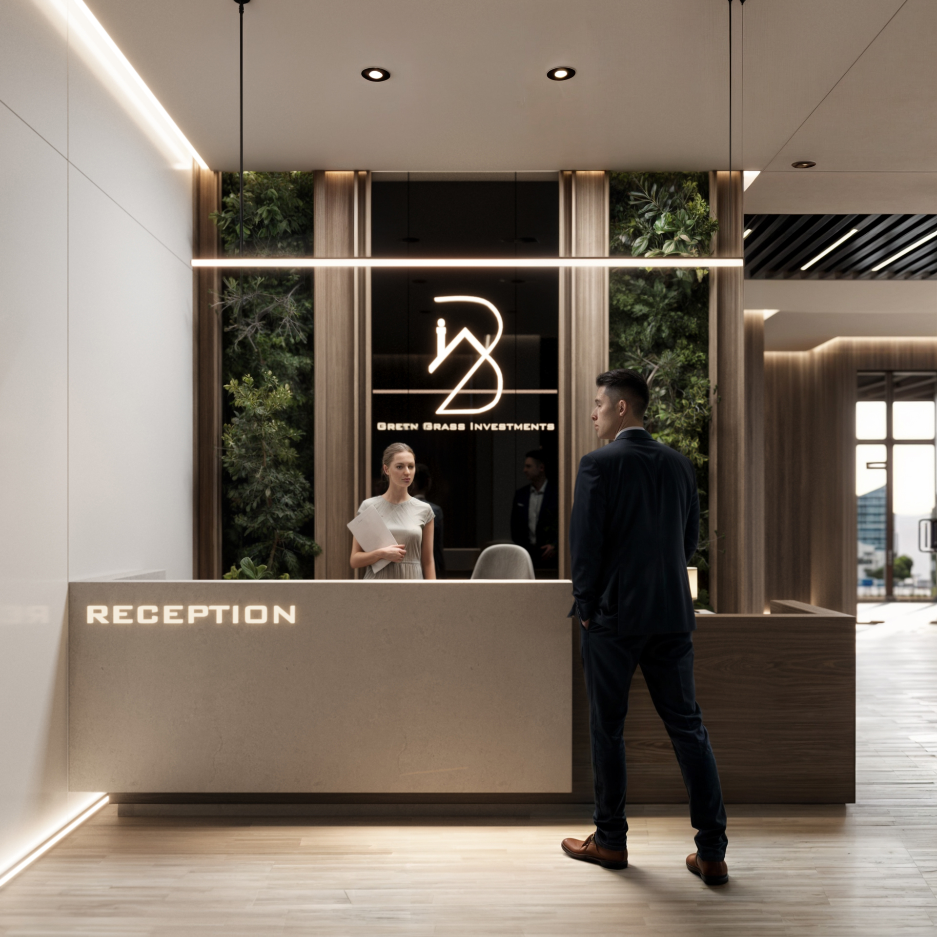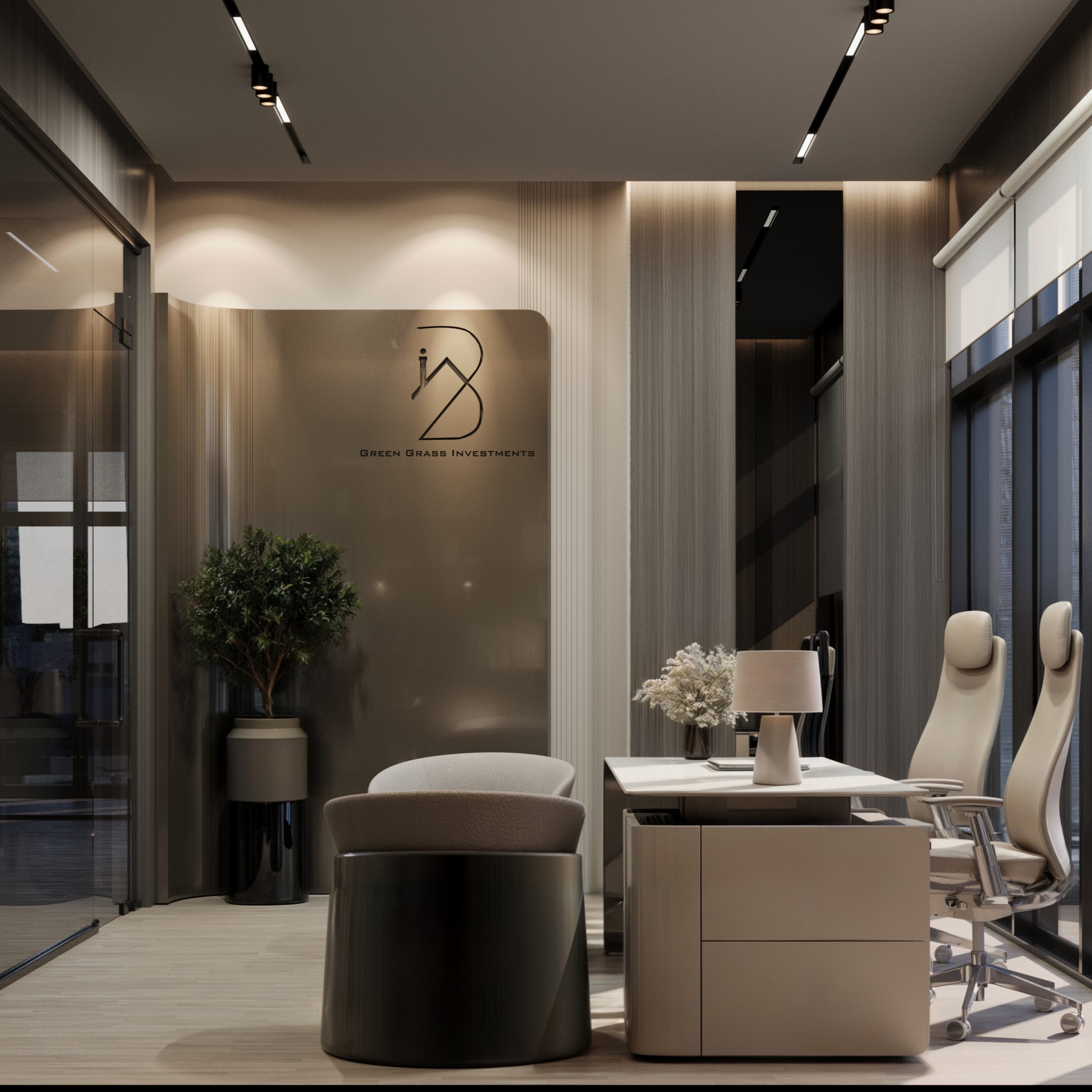 This corporate interior for Green Grass Investments exudes modern elegance and professional sophistication. The design features clean lines, rich wood textures, and integrated lighting that accentuates the architectural rhythm throughout the space. The reception area creates a memorable first impression with its minimal stone desk, green wall accents, and illuminated branding. Inside, glass partitions foster transparency and openness while preserving privacy. Natural light floods the workspaces, complemented by soft ambient lighting and tasteful greenery. The result is a contemporary workspace that balances functionality, prestige, and a welcoming atmosphere.