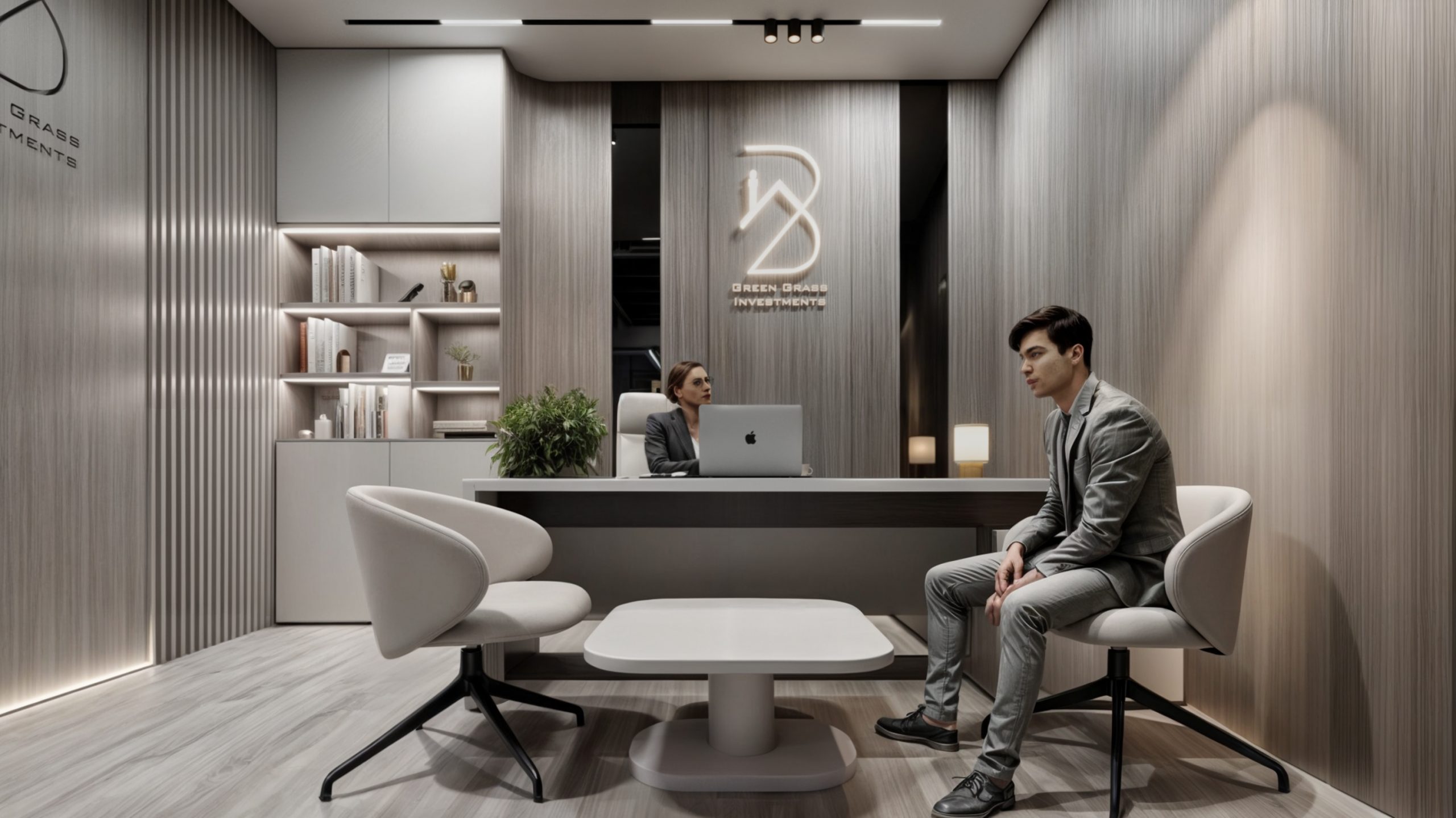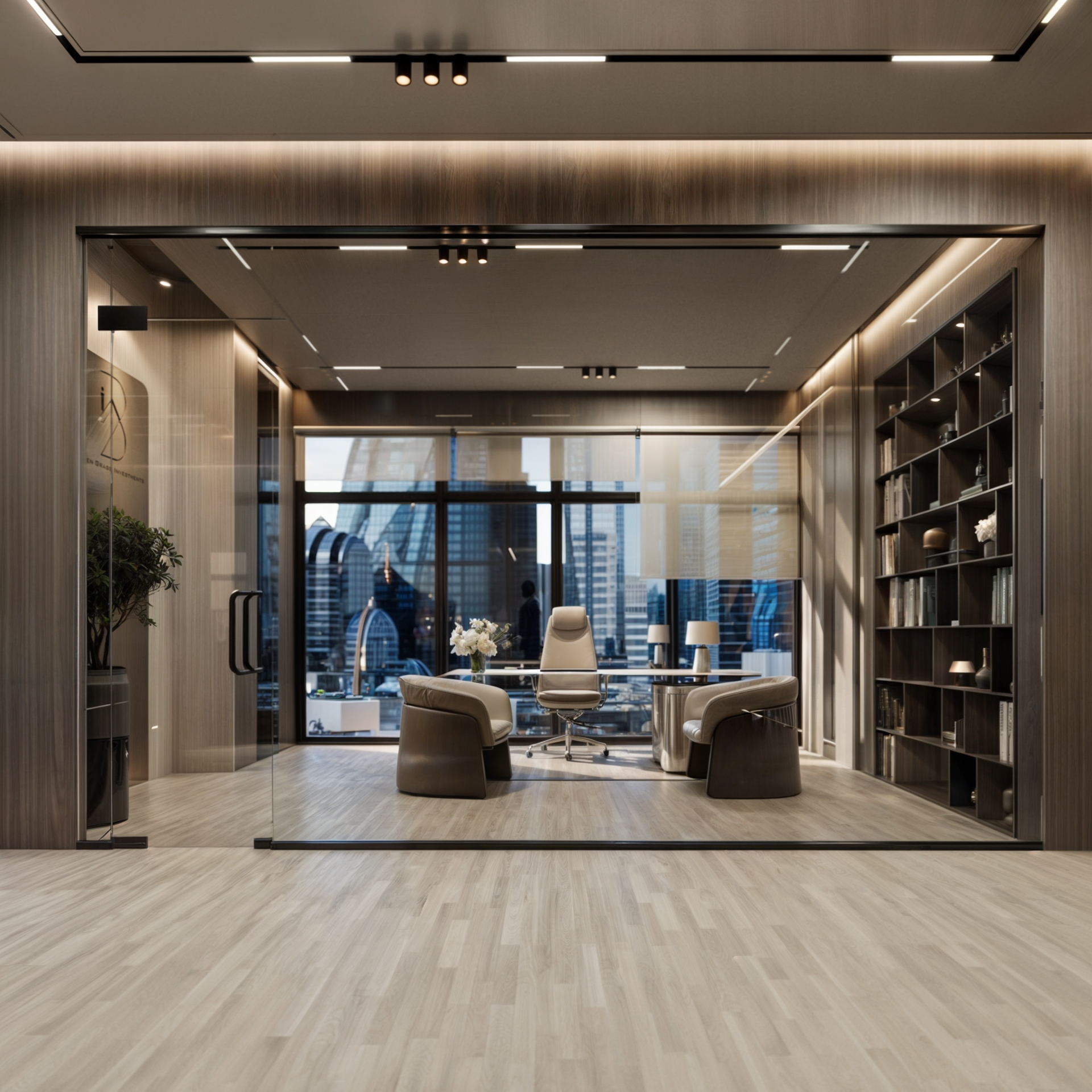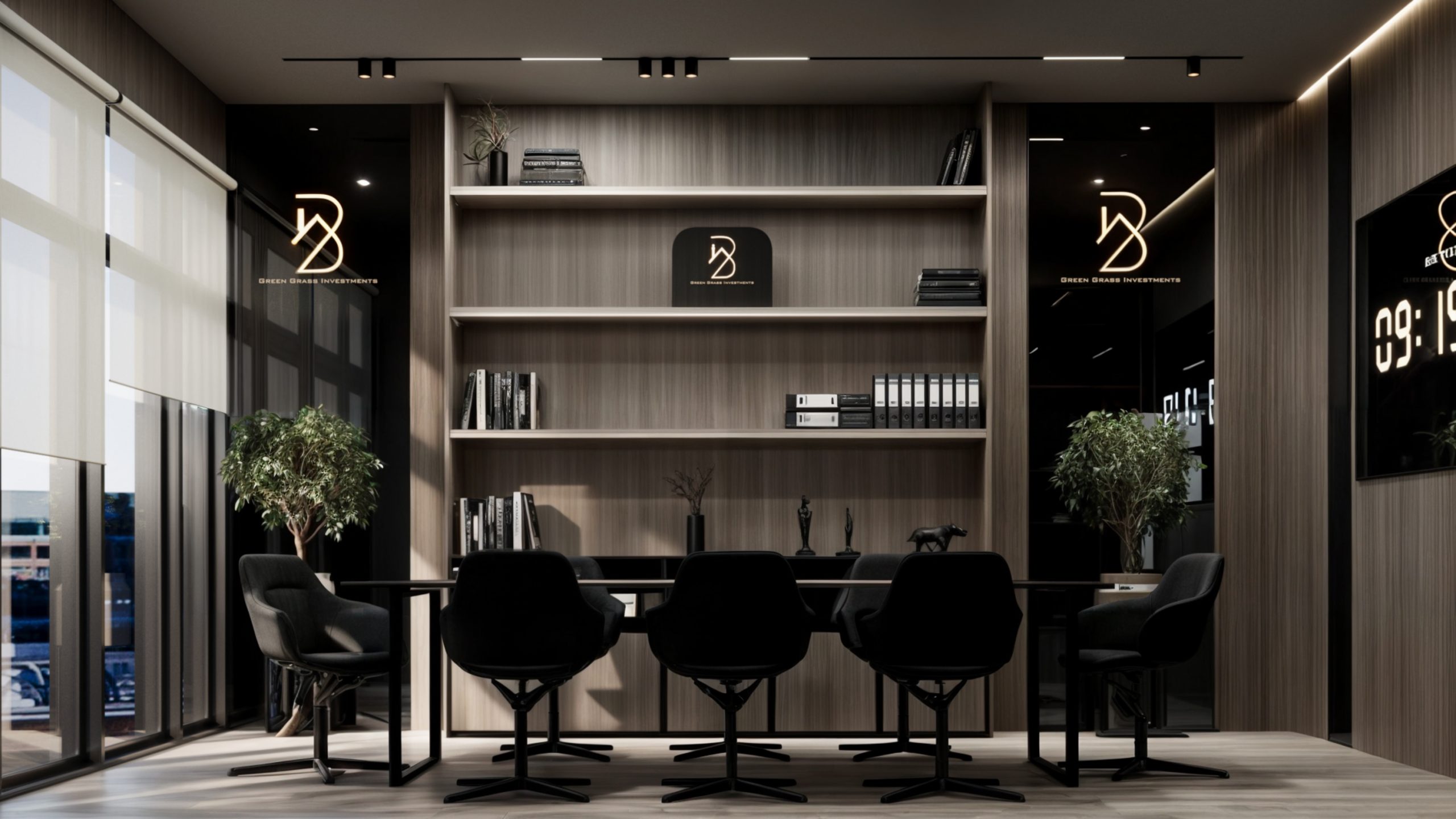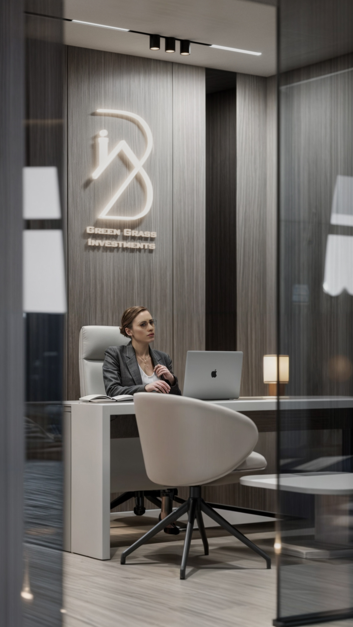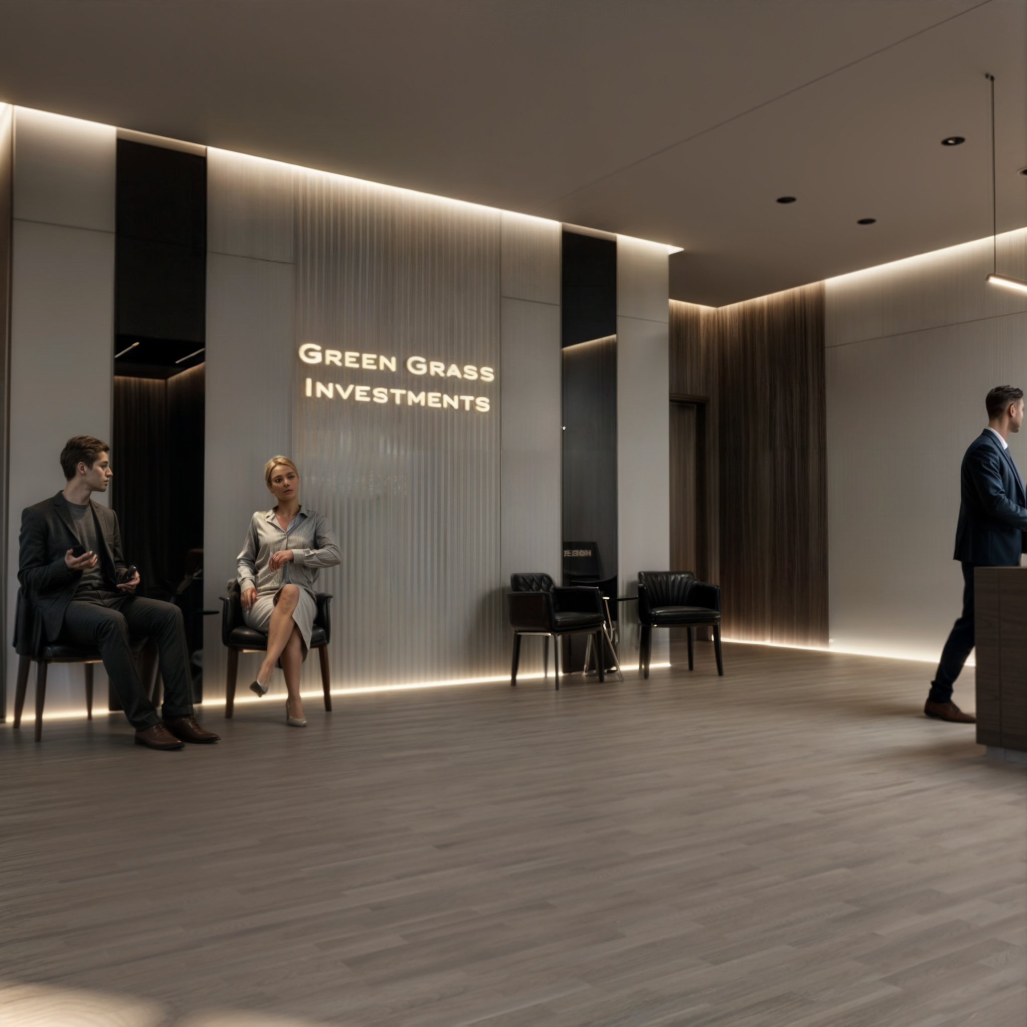 This corporate interior for Green Grass Investments exudes modern elegance and professional sophistication. The design features clean lines, rich wood textures, and integrated lighting that accentuates the architectural rhythm throughout the space. The reception area creates a memorable first impression with its minimal stone desk, green wall accents, and illuminated branding. Inside, glass partitions foster transparency and openness while preserving privacy. Natural light floods the workspaces, complemented by soft ambient lighting and tasteful greenery. The result is a contemporary workspace that balances functionality, prestige, and a welcoming atmosphere.
