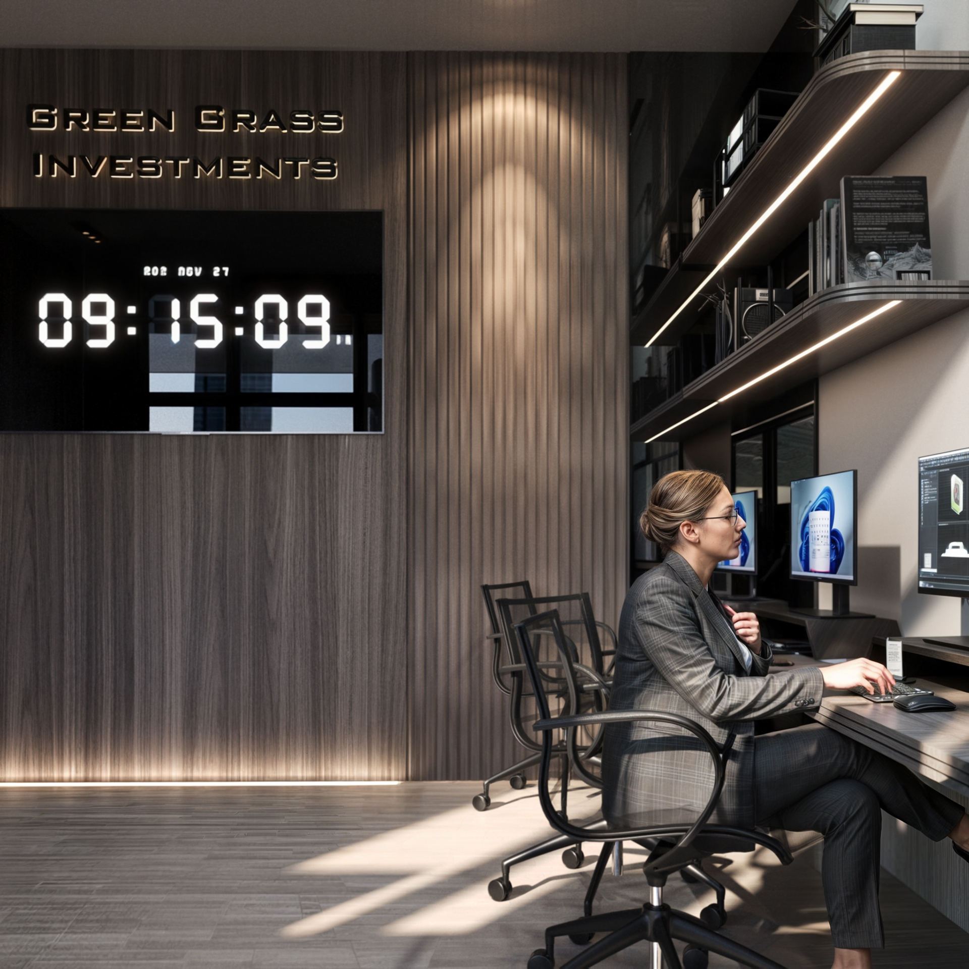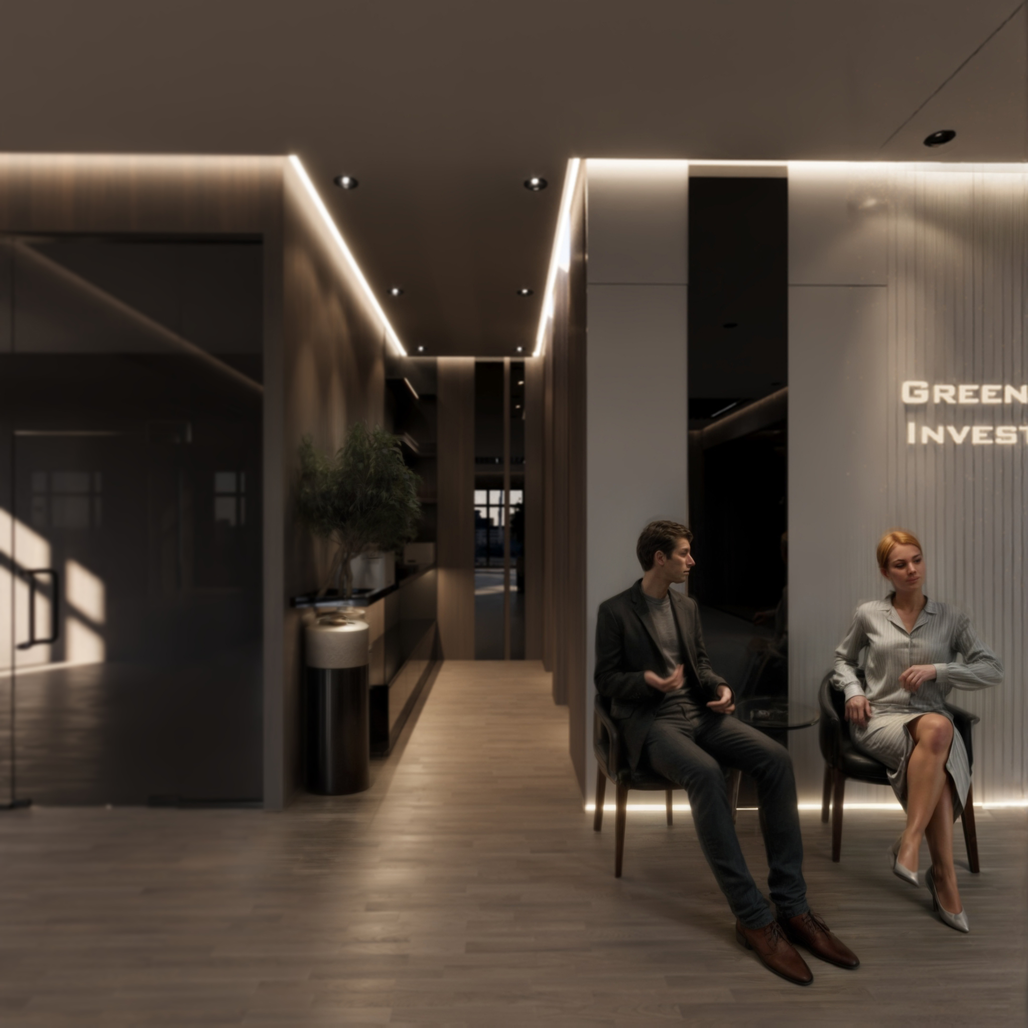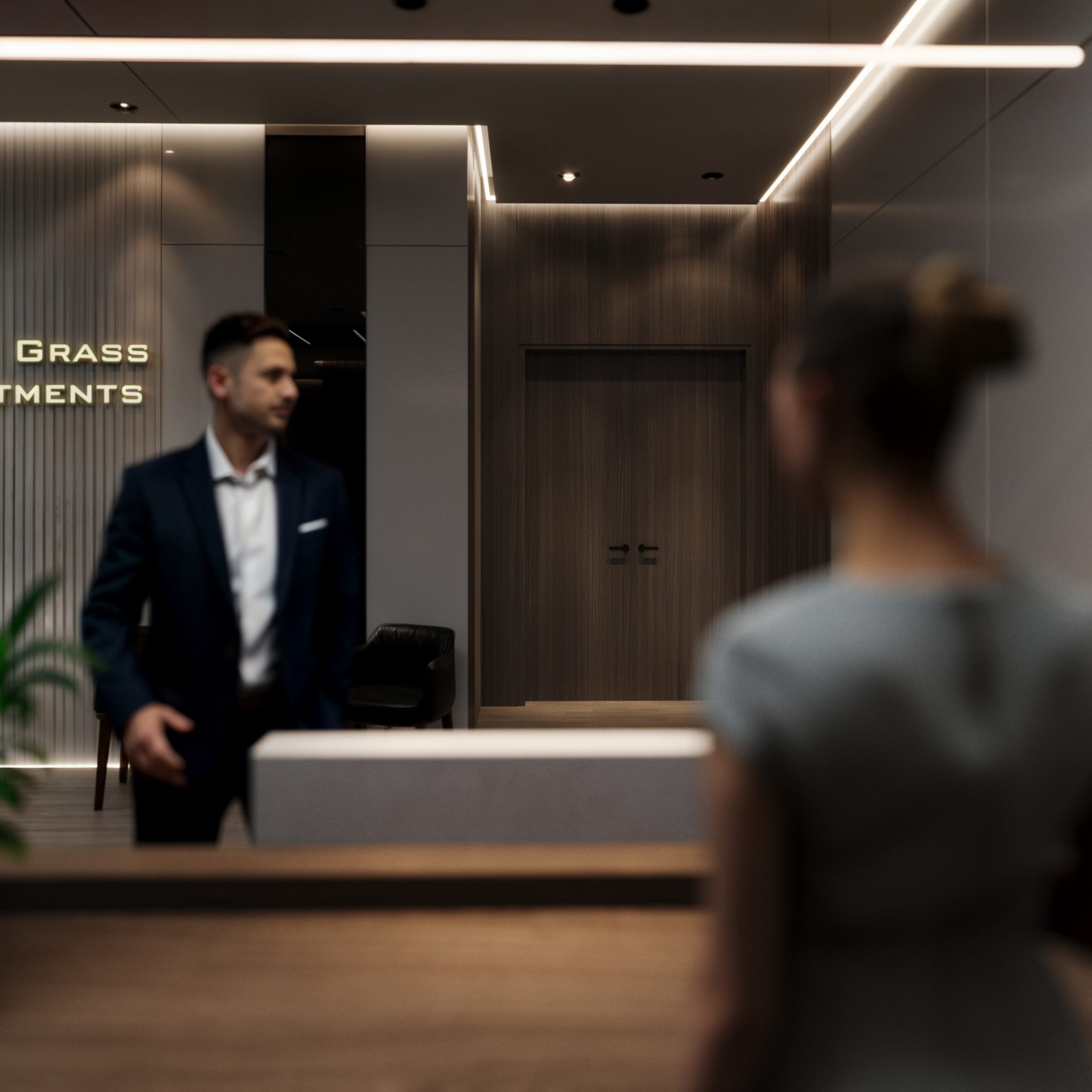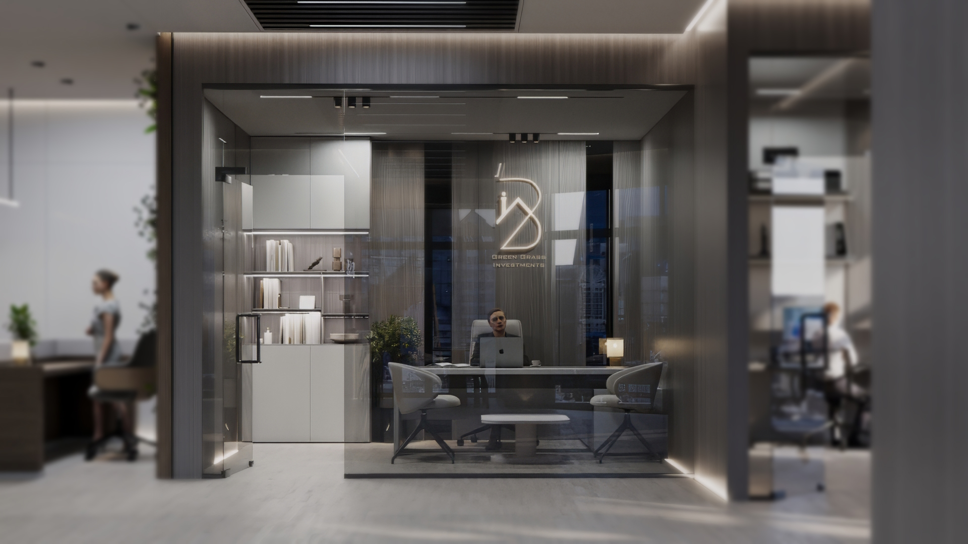 This corporate interior for Green Grass Investments exudes modern elegance and professional sophistication. The design features clean lines, rich wood textures, and integrated lighting that accentuates the architectural rhythm throughout the space. The reception area creates a memorable first impression with its minimal stone desk, green wall accents, and illuminated branding. Inside, glass partitions foster transparency and openness while preserving privacy. Natural light floods the workspaces, complemented by soft ambient lighting and tasteful greenery. The result is a contemporary workspace that balances functionality, prestige, and a welcoming atmosphere.