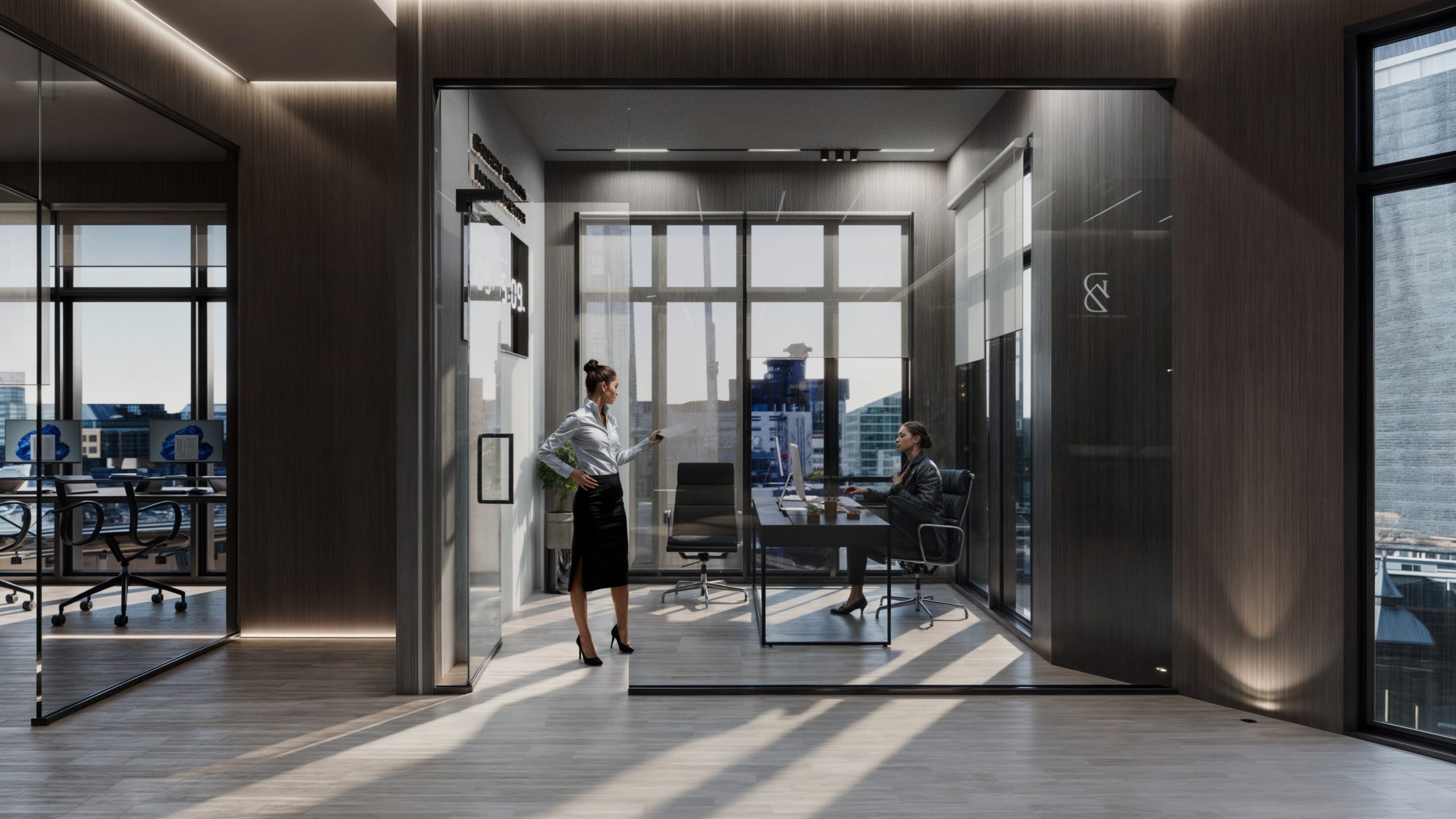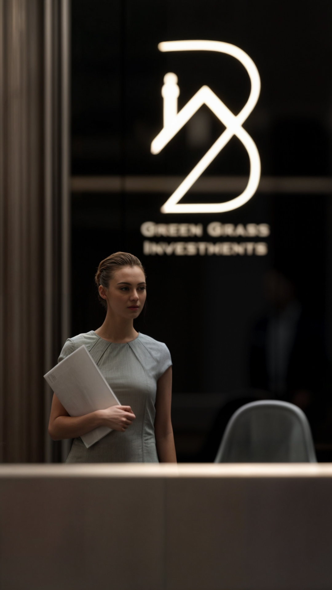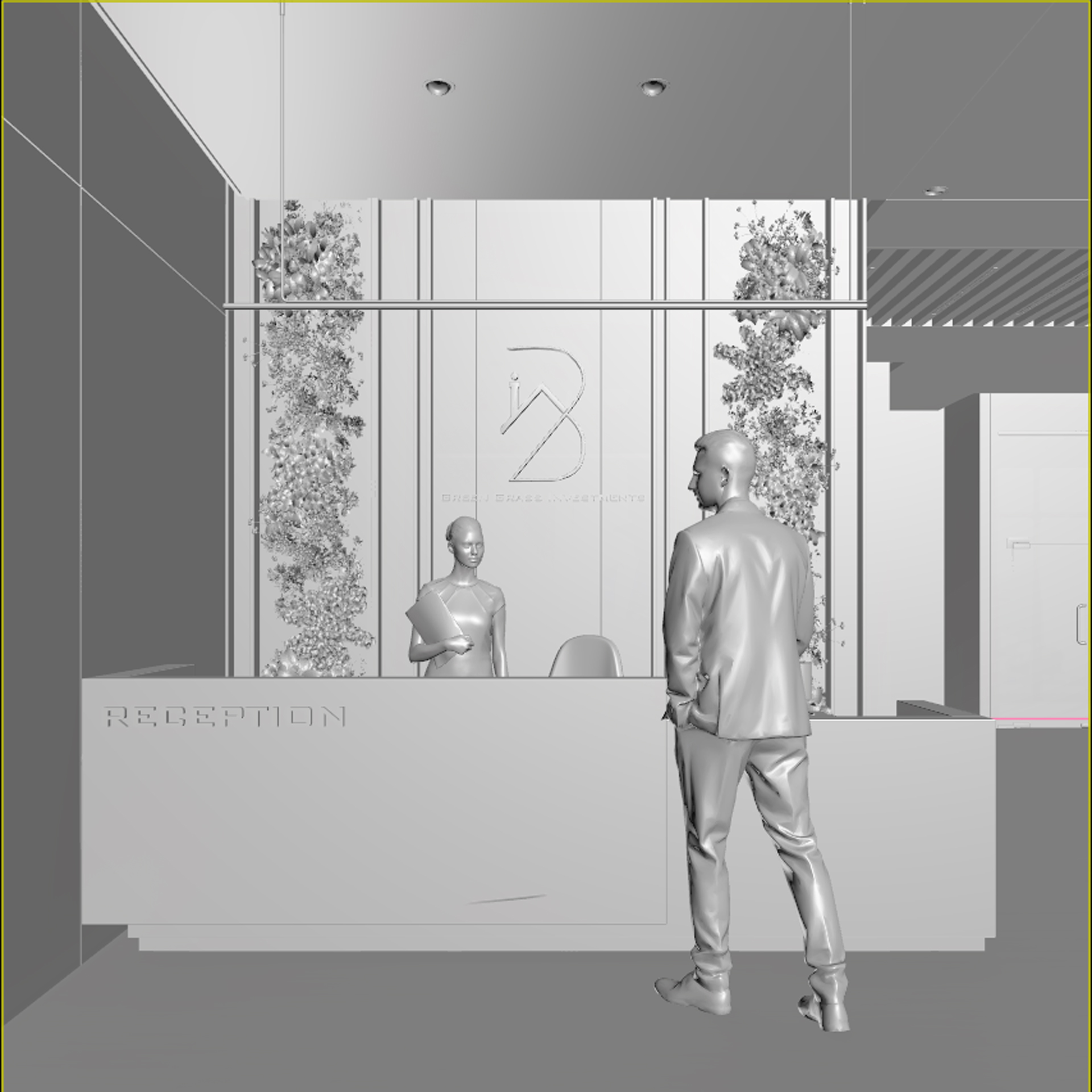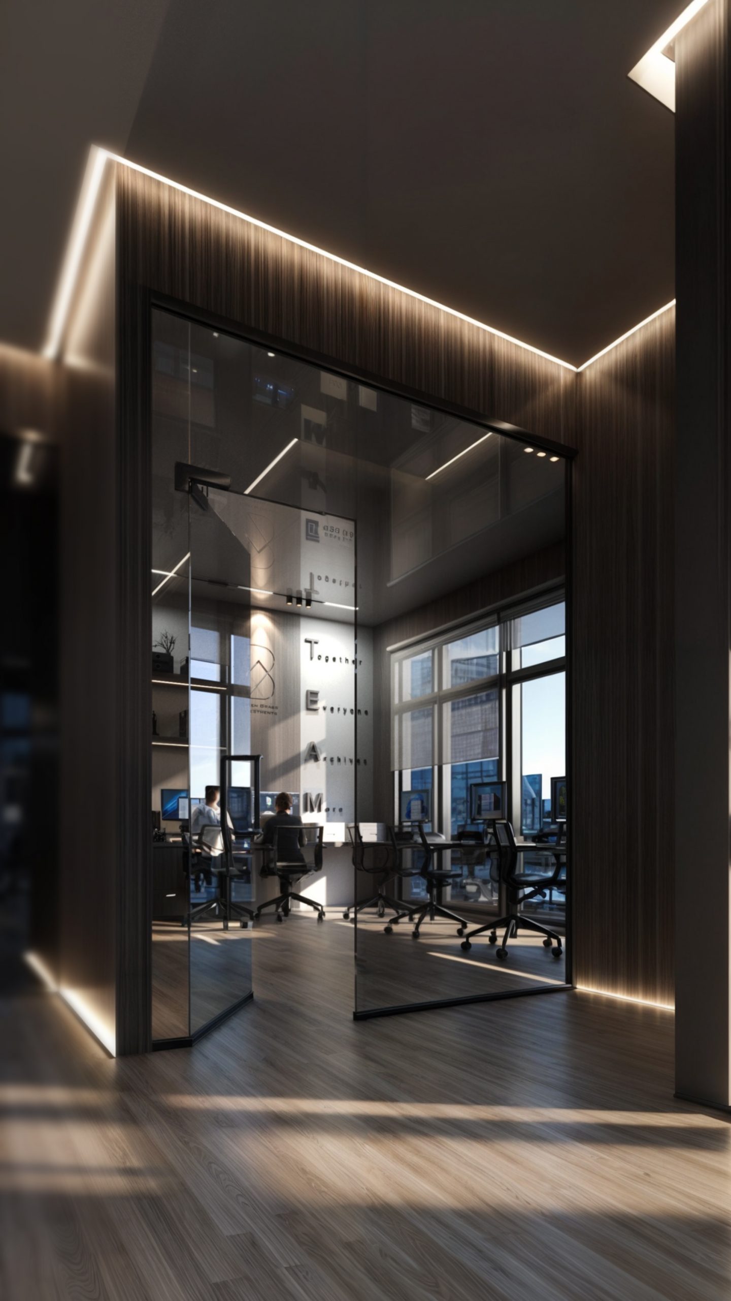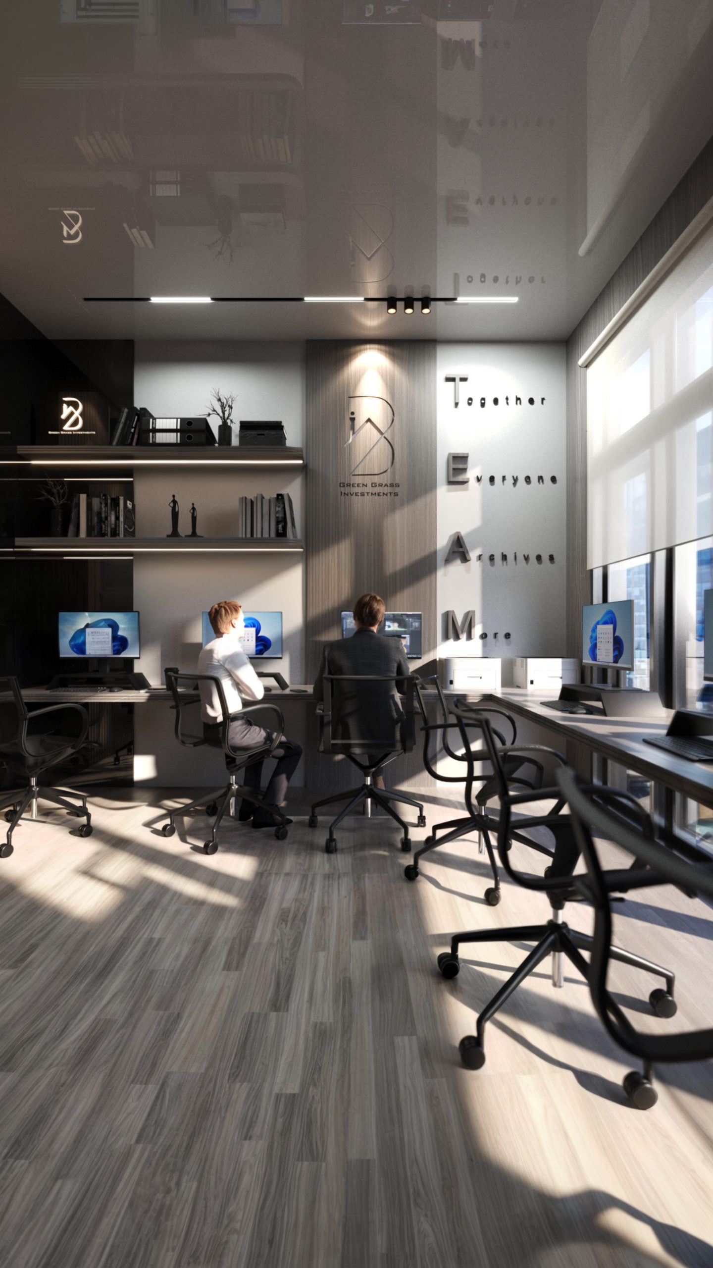 This corporate interior for Green Grass Investments exudes modern elegance and professional sophistication. The design features clean lines, rich wood textures, and integrated lighting that accentuates the architectural rhythm throughout the space. The reception area creates a memorable first impression with its minimal stone desk, green wall accents, and illuminated branding. Inside, glass partitions foster transparency and openness while preserving privacy. Natural light floods the workspaces, complemented by soft ambient lighting and tasteful greenery. The result is a contemporary workspace that balances functionality, prestige, and a welcoming atmosphere.