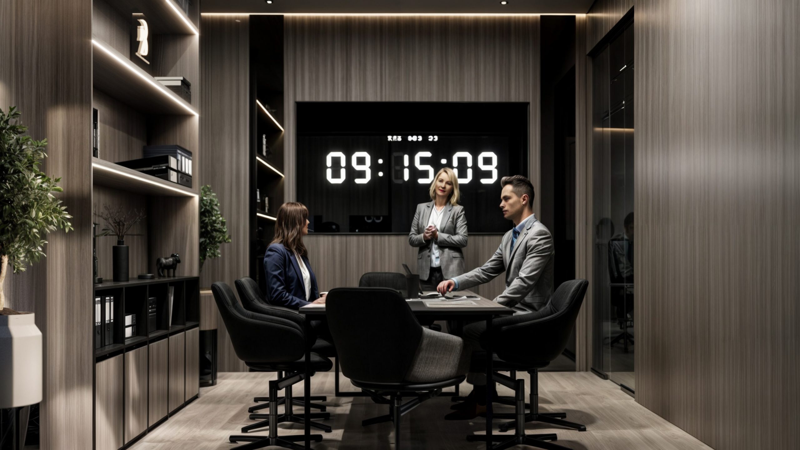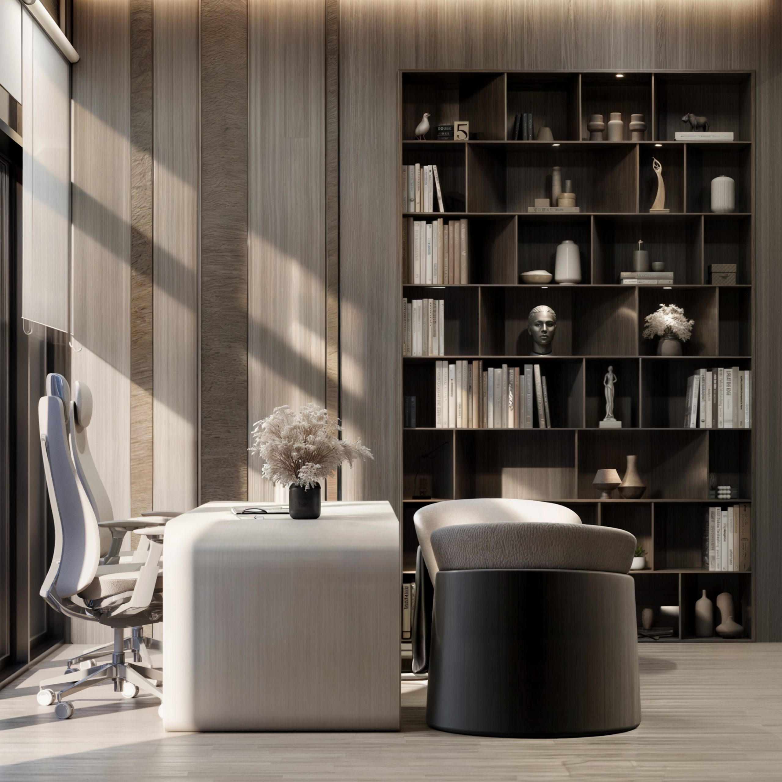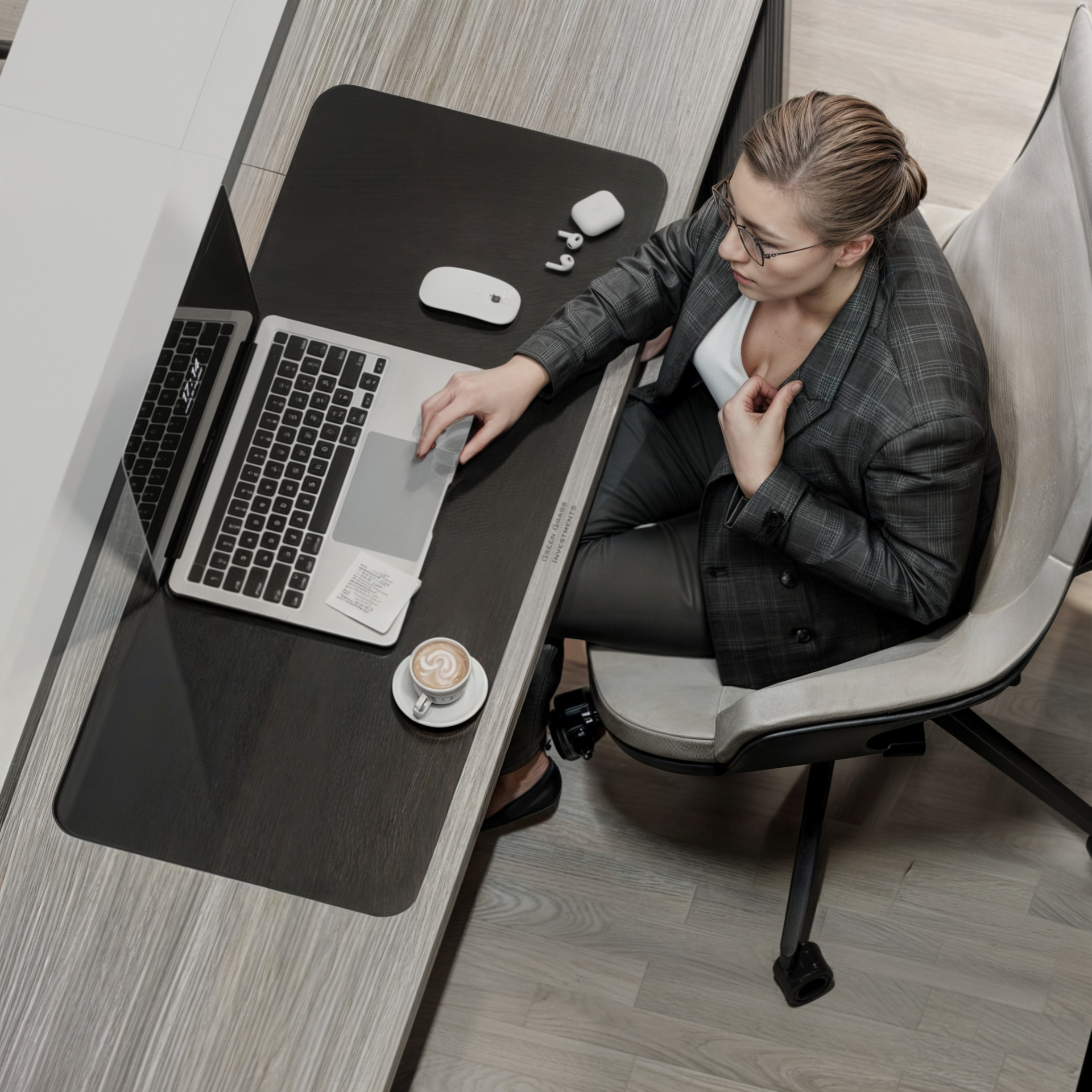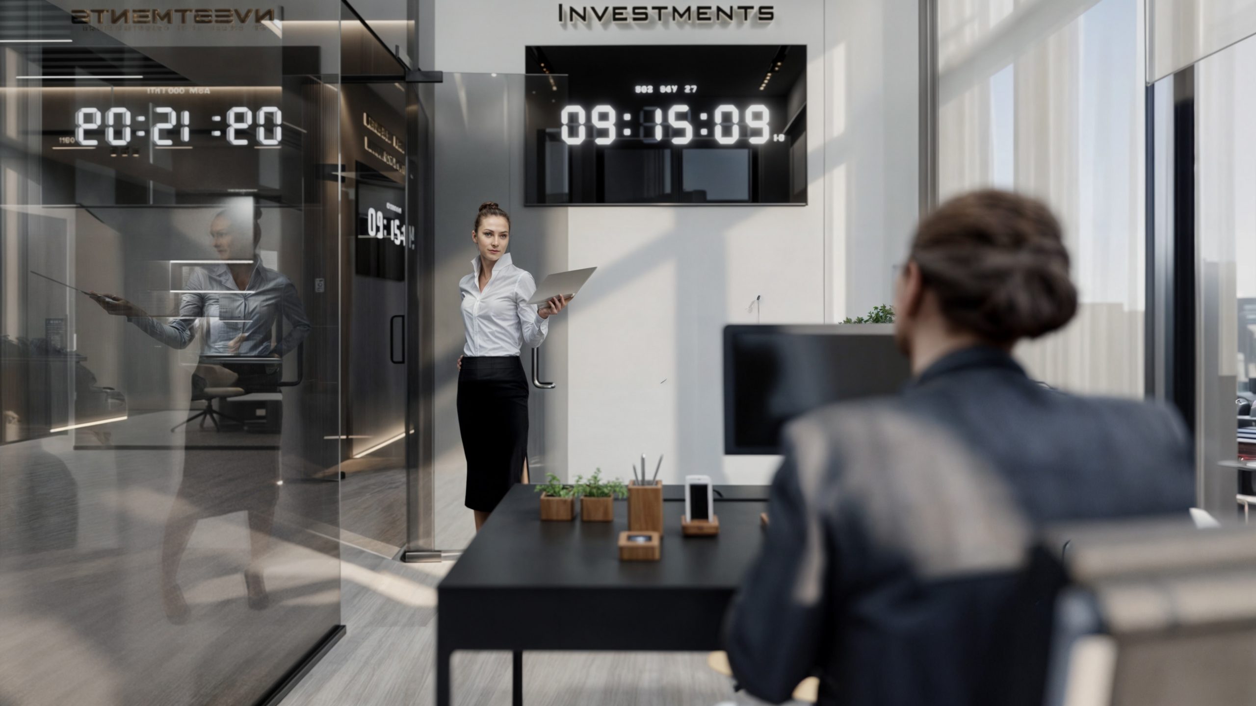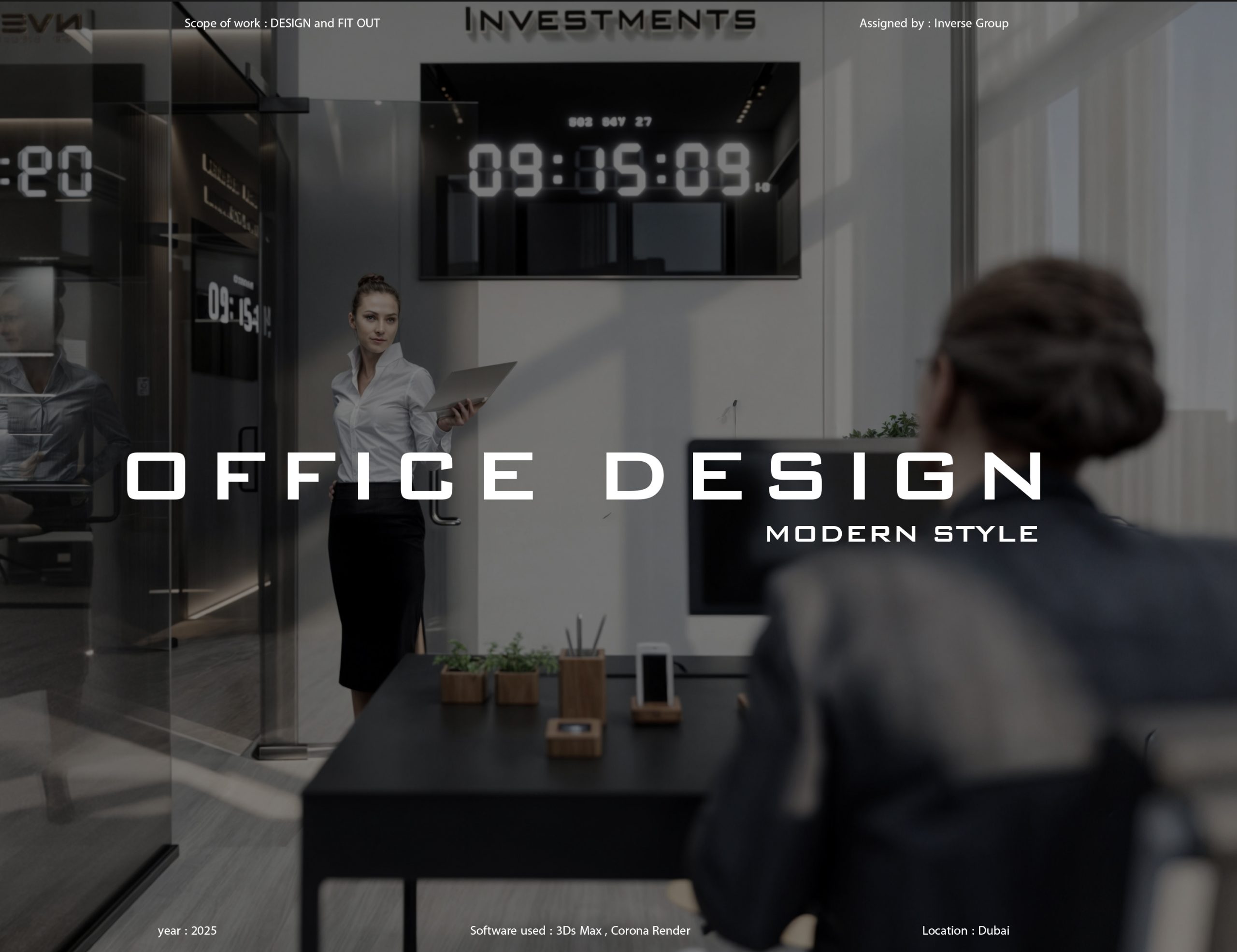 This corporate interior for Green Grass Investments exudes modern elegance and professional sophistication. The design features clean lines, rich wood textures, and integrated lighting that accentuates the architectural rhythm throughout the space. The reception area creates a memorable first impression with its minimal stone desk, green wall accents, and illuminated branding. Inside, glass partitions foster transparency and openness while preserving privacy. Natural light floods the workspaces, complemented by soft ambient lighting and tasteful greenery. The result is a contemporary workspace that balances functionality, prestige, and a welcoming atmosphere.