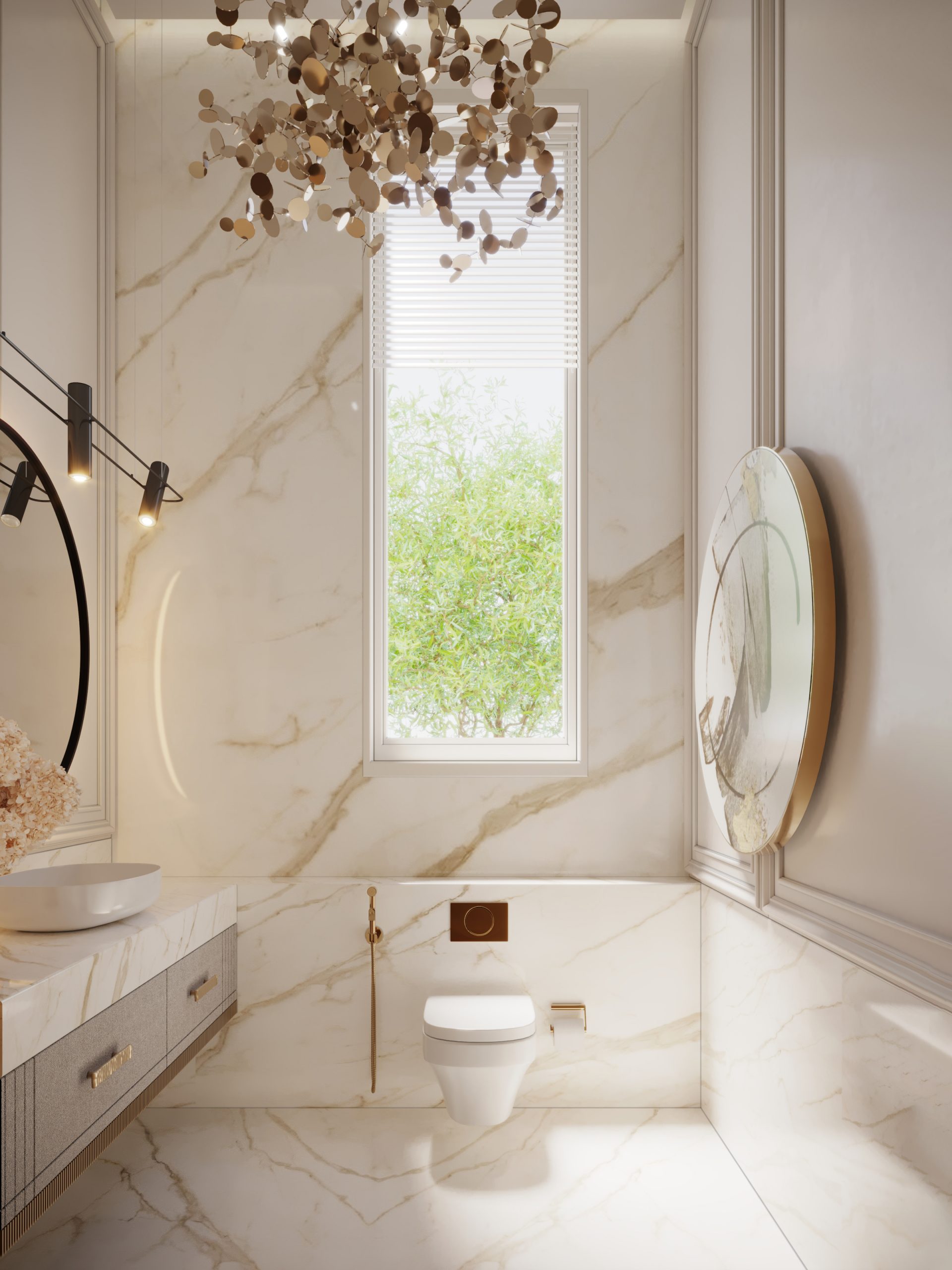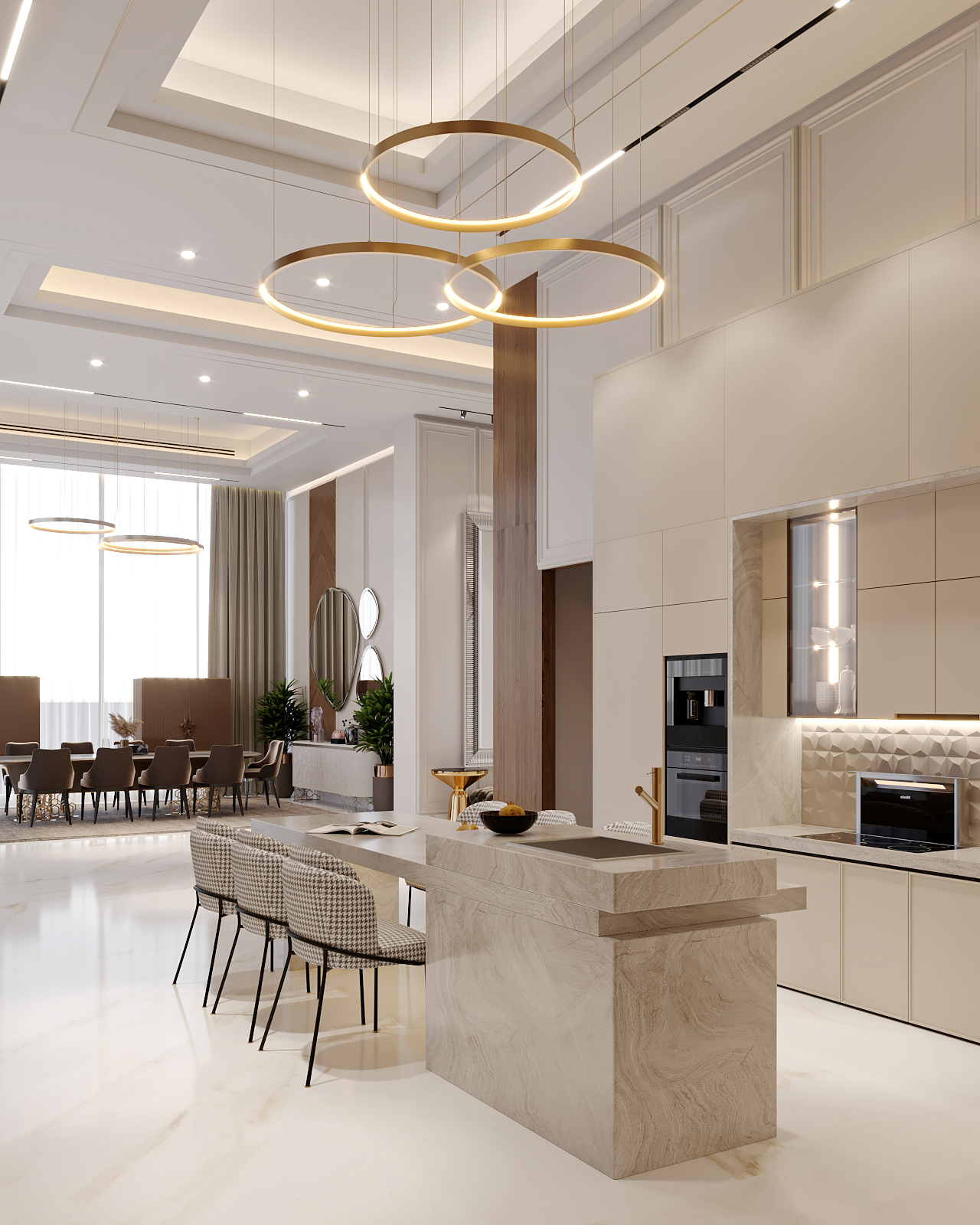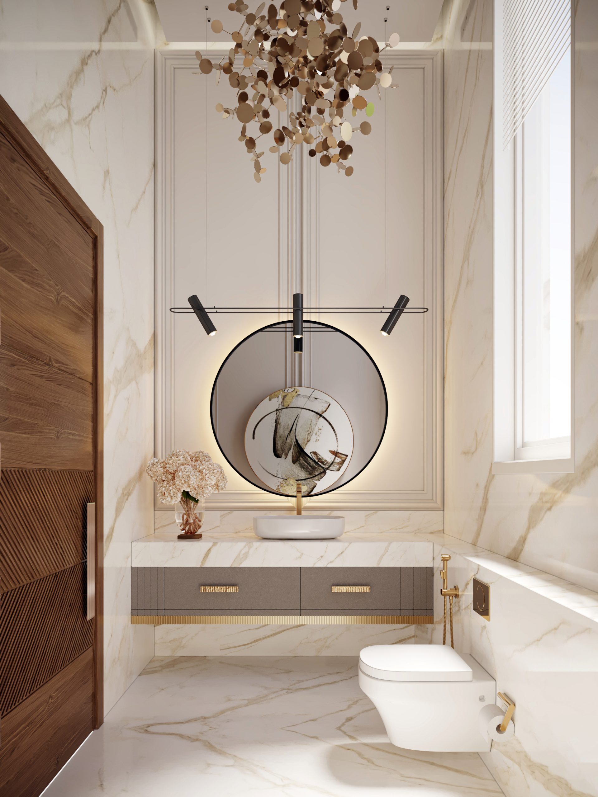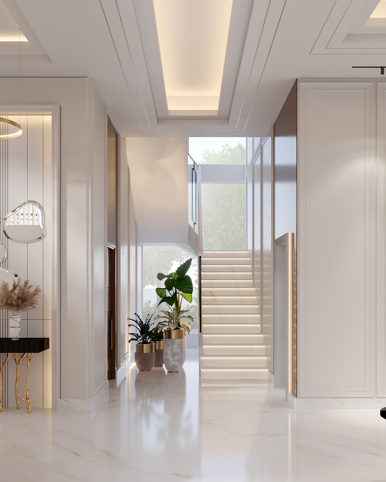 This bold contemporary villa combines high-end modern design with subtle cultural identity. The façade is layered with luxurious materials—ranging from textured travertine to polished gray marble—framing expansive glass panels. Intricately perforated screens inspired by traditional mashrabiya patterns offer a modern take on cultural motifs while ensuring privacy and filtered light. The vertical wooden entrance door becomes a warm focal point, contrasting with the crisp, geometric composition of the elevation. This villa stands out as a harmonious blend of modern sophistication and regional design language.