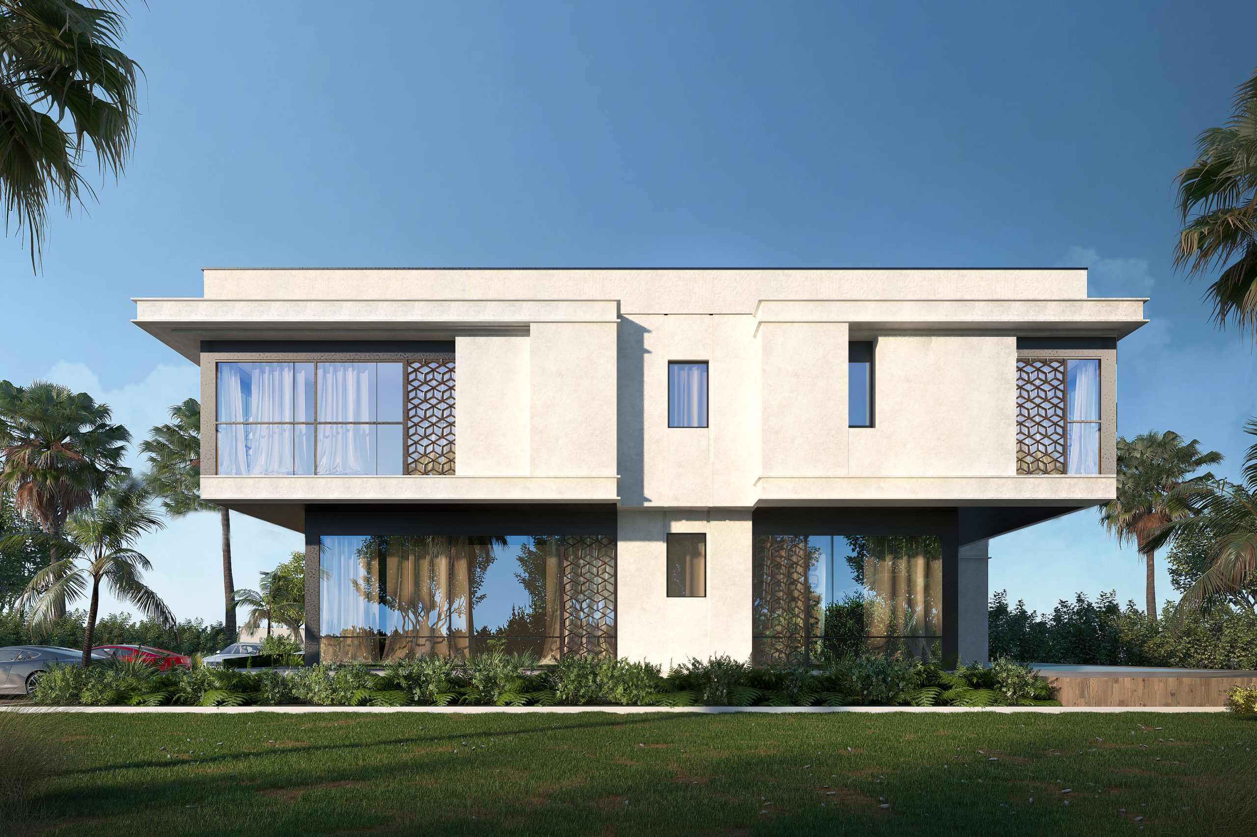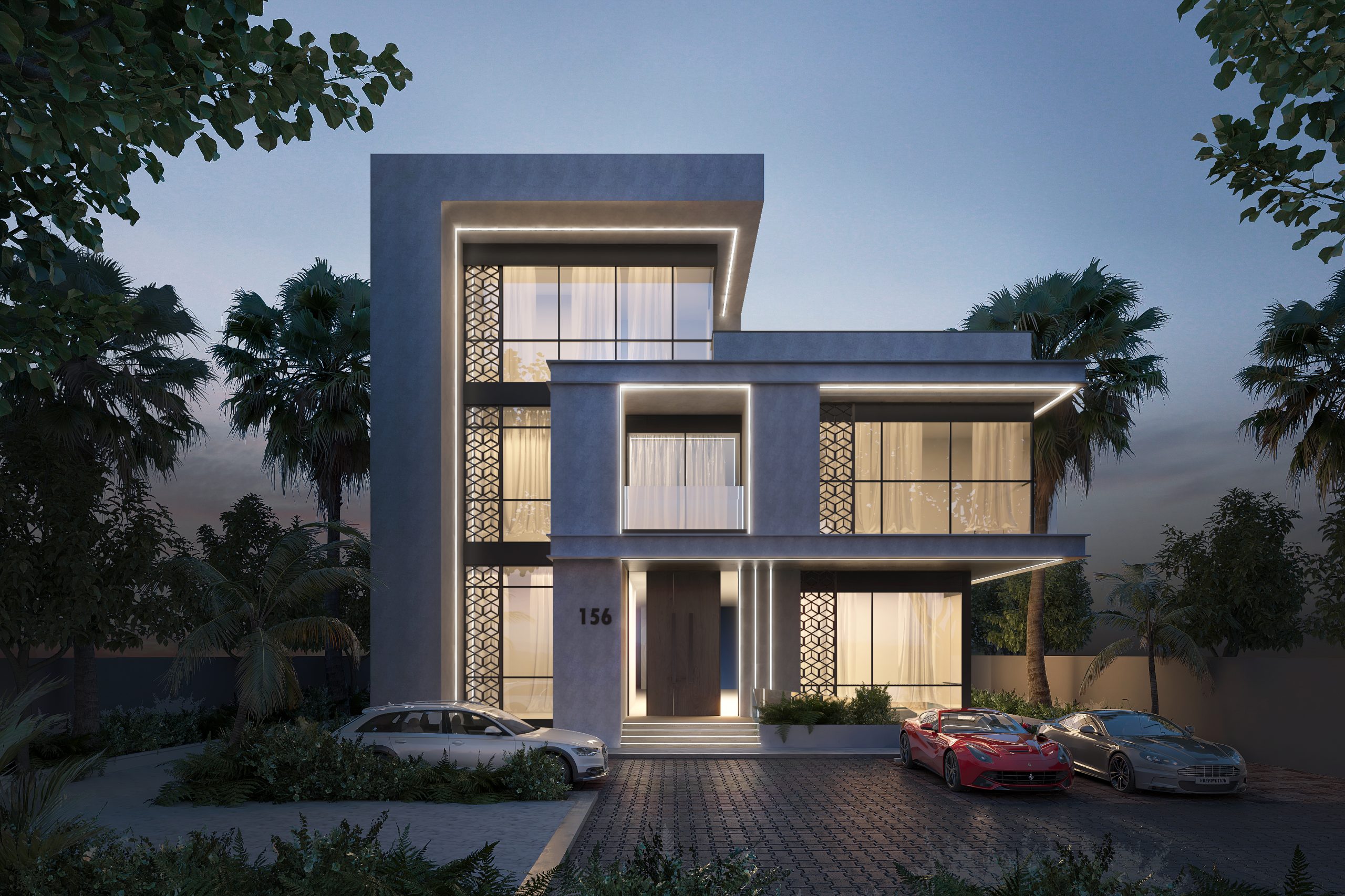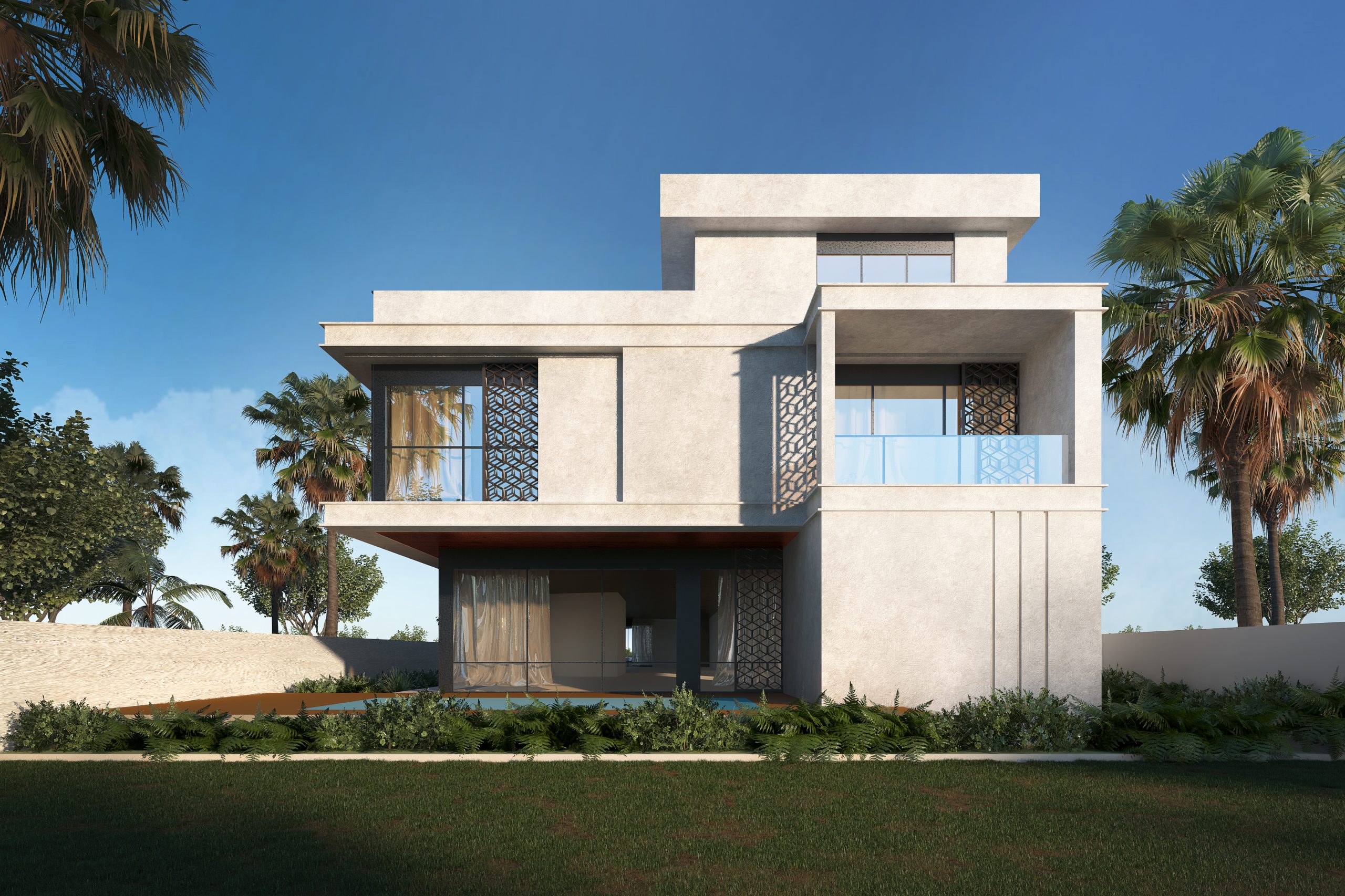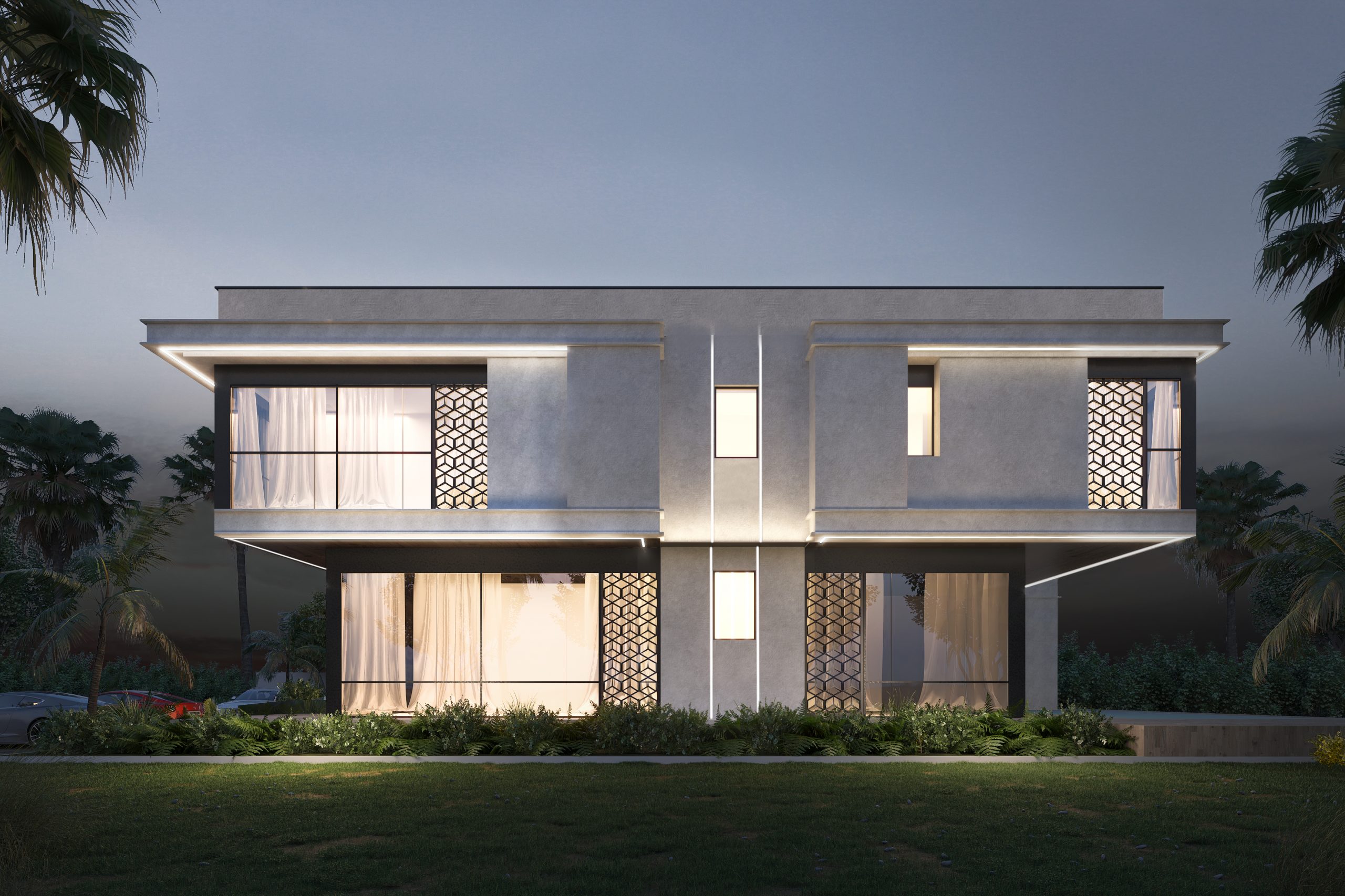 This contemporary villa merges modern architecture with subtle cultural motifs, achieving a balanced aesthetic between minimalism and tradition. The clean horizontal volumes and large glazing maximize openness and natural light, while decorative mashrabiya-inspired panels introduce texture and identity. Linear lighting elements outline the building’s geometry, adding drama and rhythm—especially in the evening. The muted color palette, combined with soft landscaping and warm interior glows, completes the look of a sophisticated and culturally rooted modern residence.
