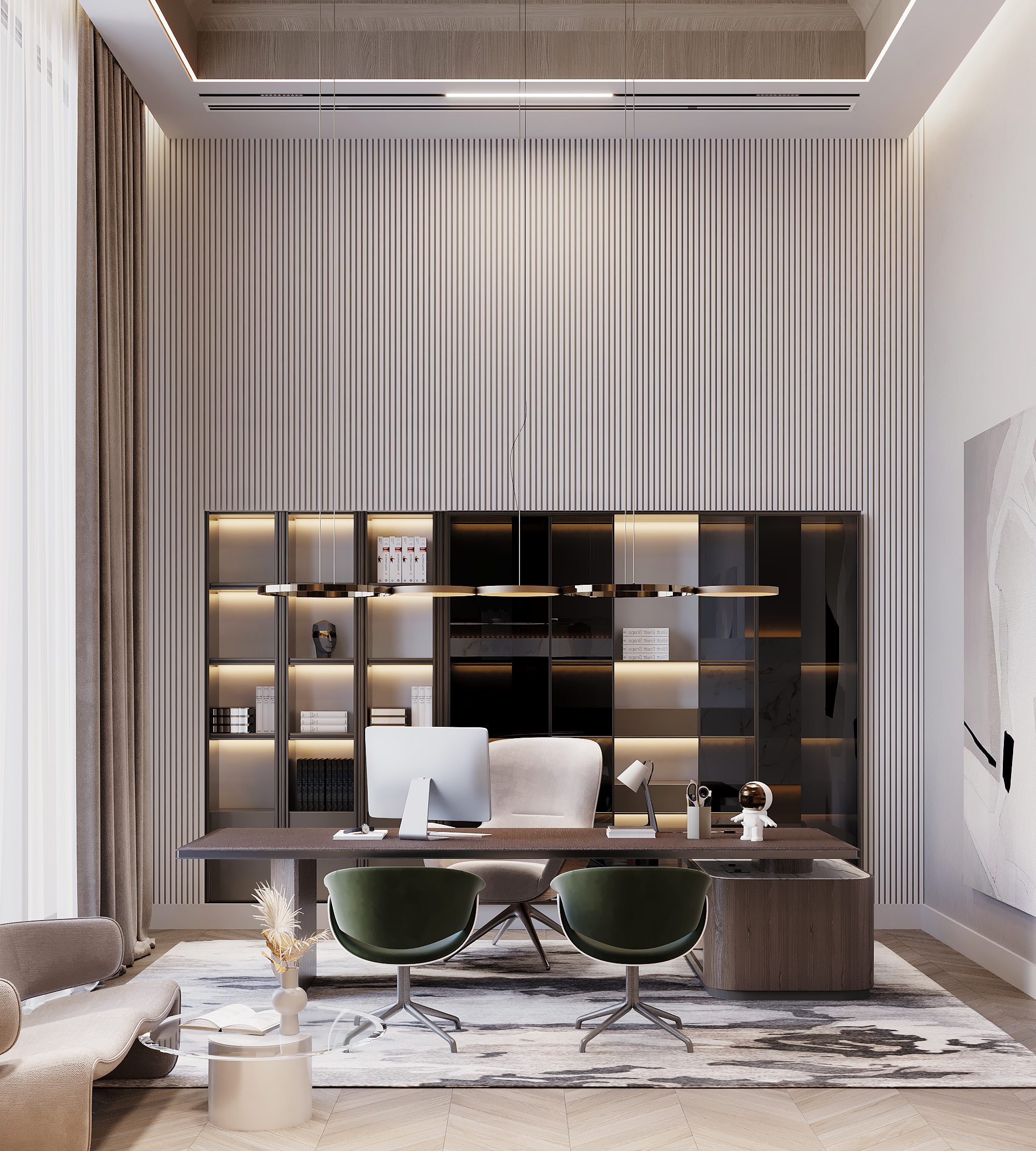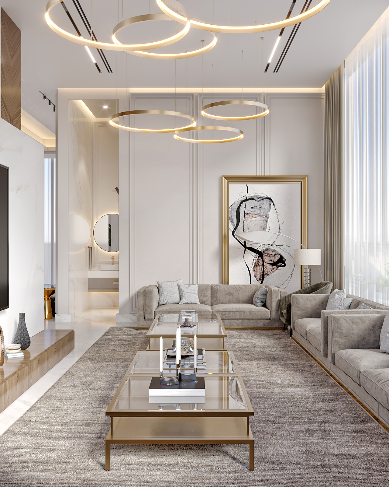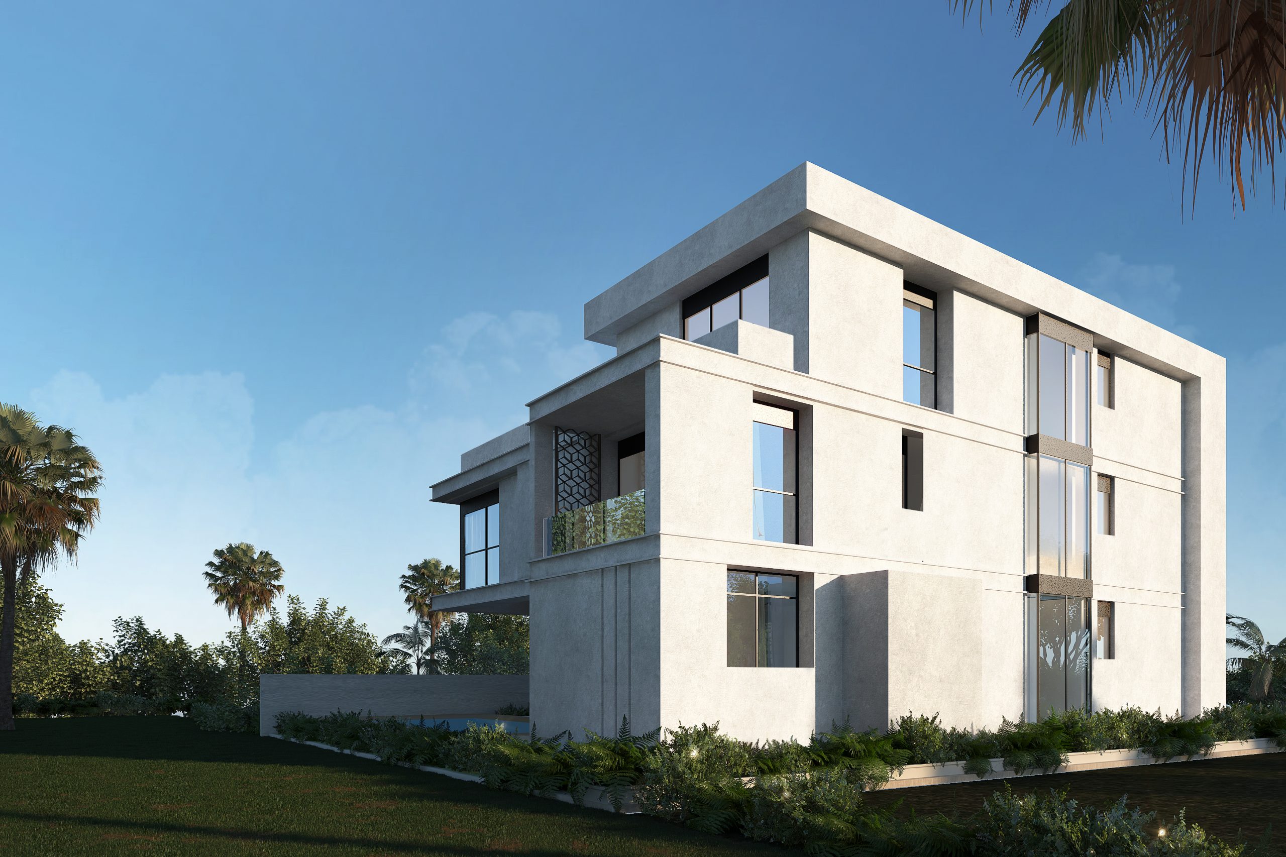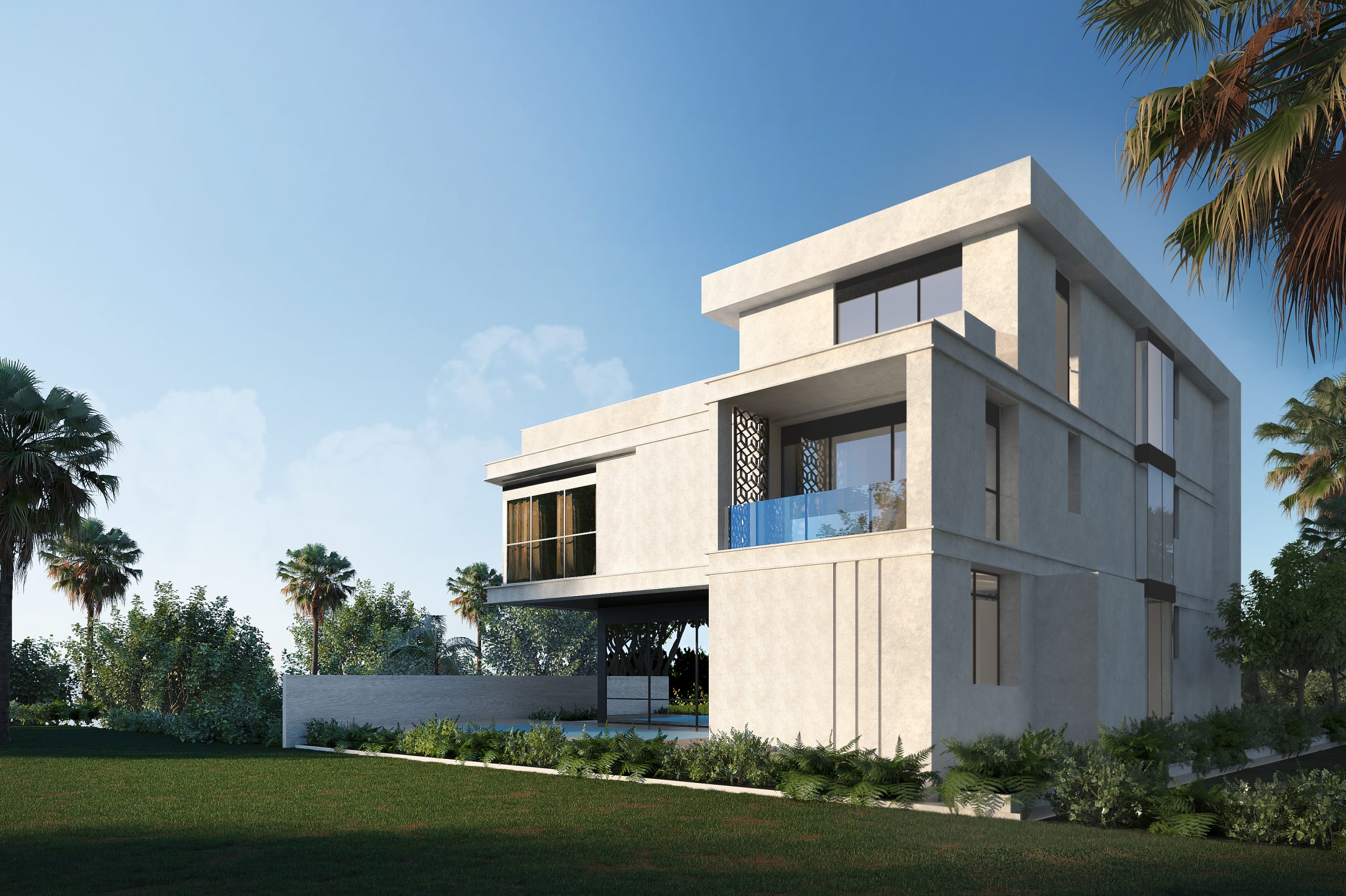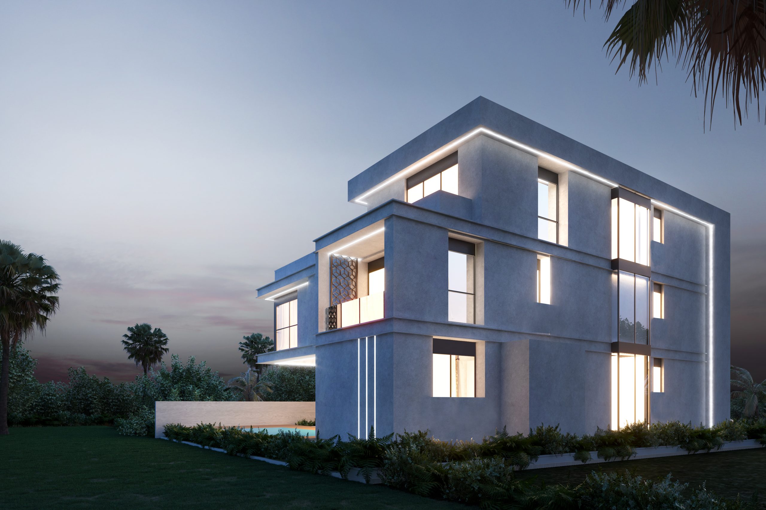 This contemporary villa merges modern architecture with subtle cultural motifs, achieving a balanced aesthetic between minimalism and tradition. The clean horizontal volumes and large glazing maximize openness and natural light, while decorative mashrabiya-inspired panels introduce texture and identity. Linear lighting elements outline the building’s geometry, adding drama and rhythm—especially in the evening. The muted color palette, combined with soft landscaping and warm interior glows, completes the look of a sophisticated and culturally rooted modern residence.