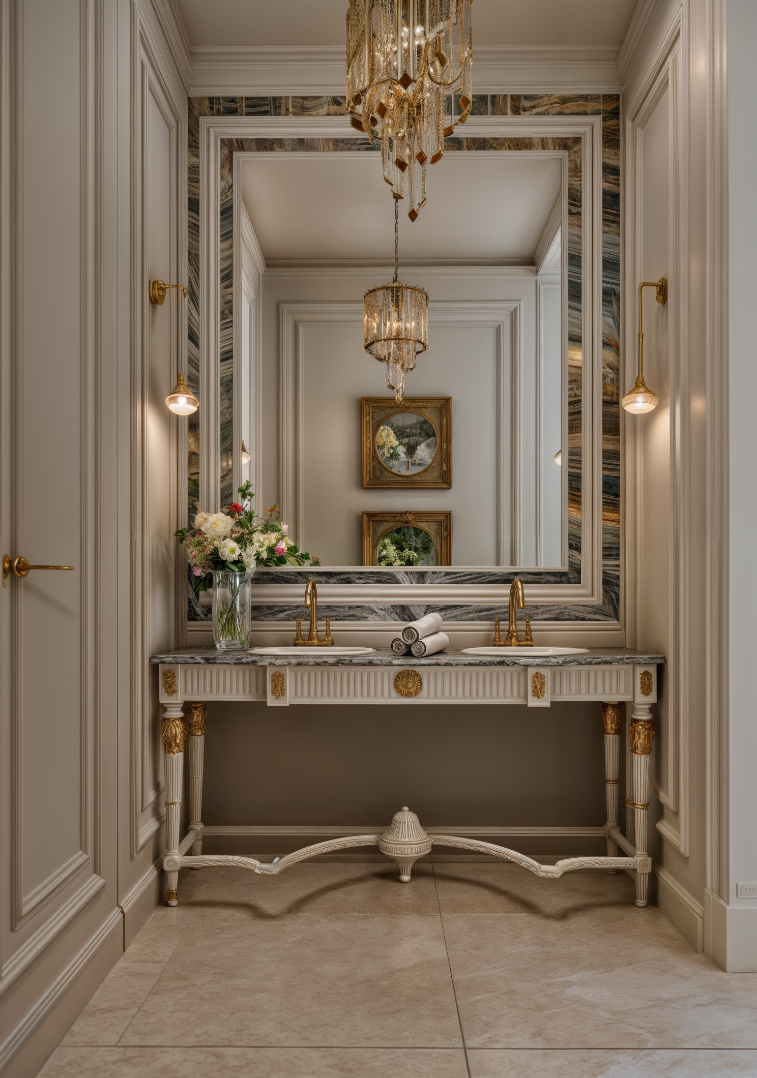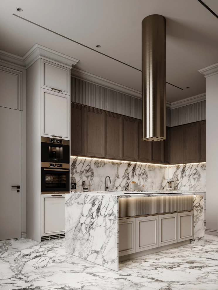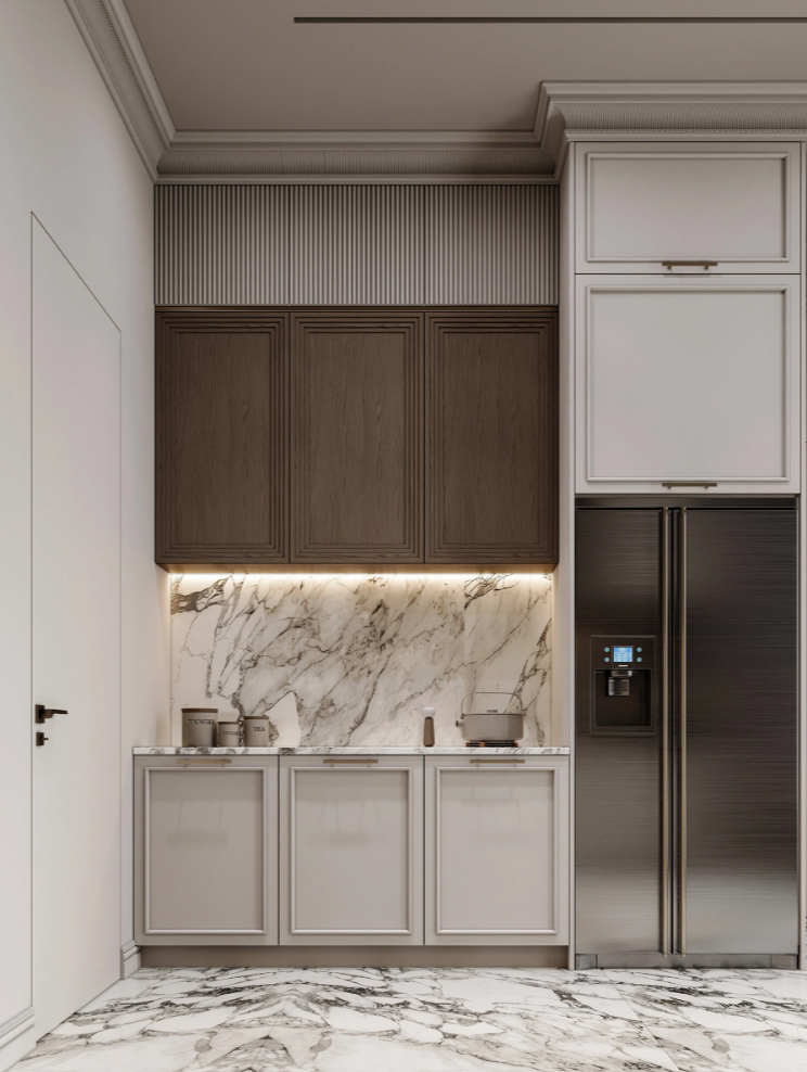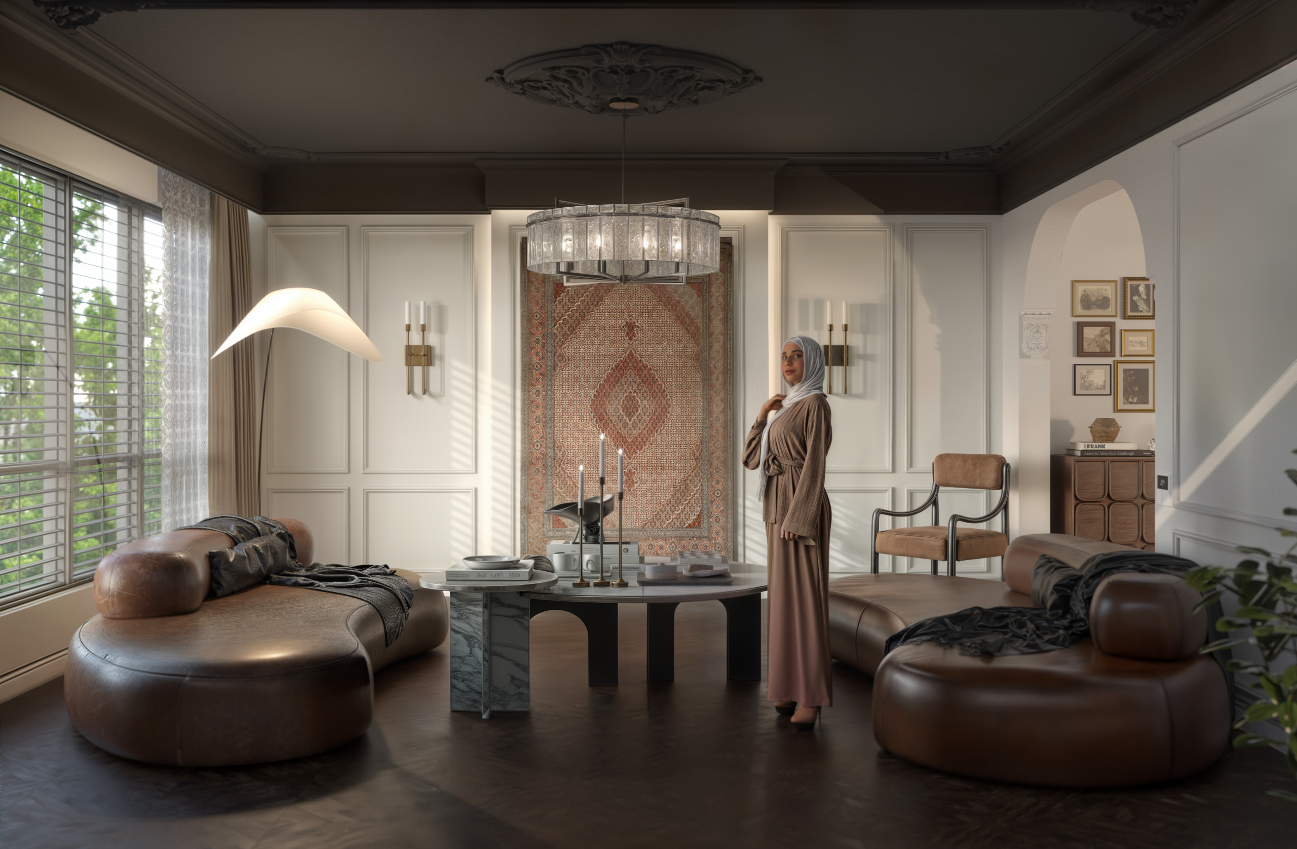 This interior design concept blends Contemporary Neo-Classical elegance with subtle Middle Eastern charm. The space features classic wall paneling, luxurious finishes like black marble and dark wood parquet, and curated modern furniture with soft curves. Elegant lighting elements—such as sculptural chandeliers and brass wall sconces—add warmth and sophistication. Rich textures, a muted earthy palette, and a statement Persian rug create a cozy yet refined ambiance. The result is a timeless, culturally inspired interior that merges tradition with modern luxury.