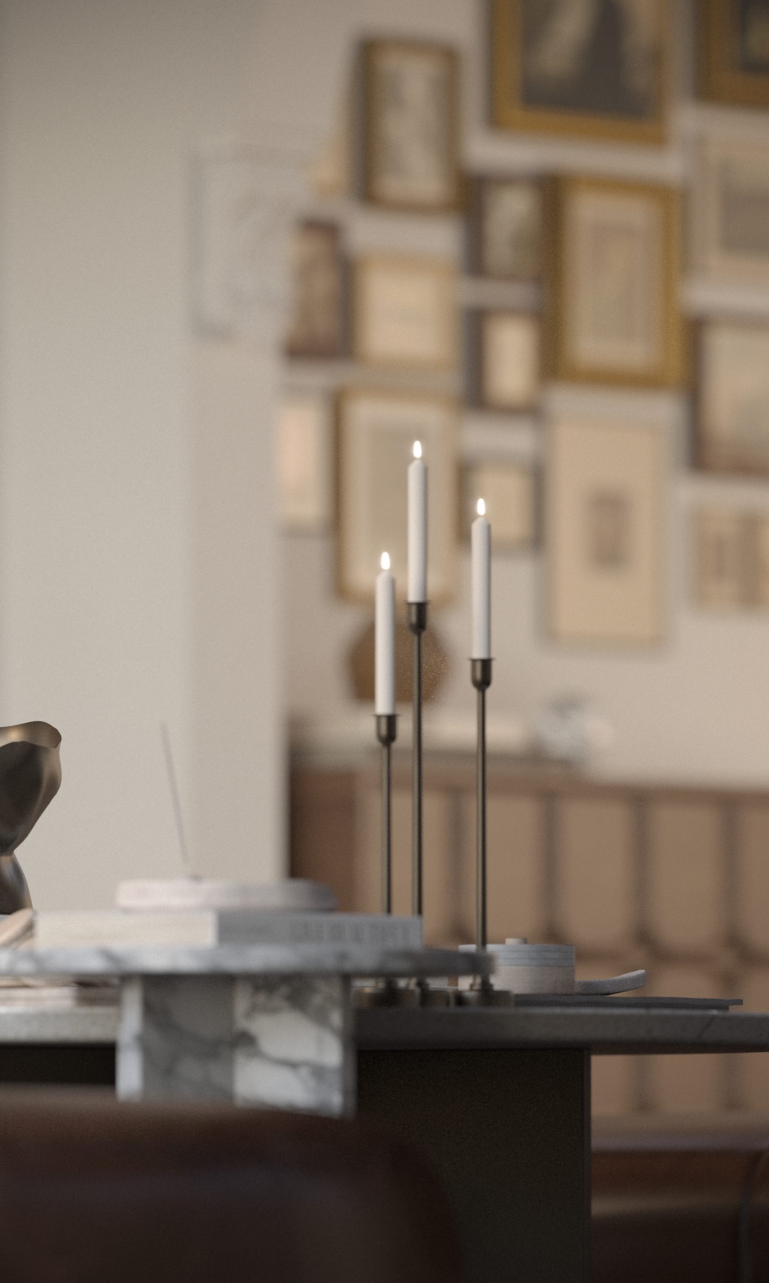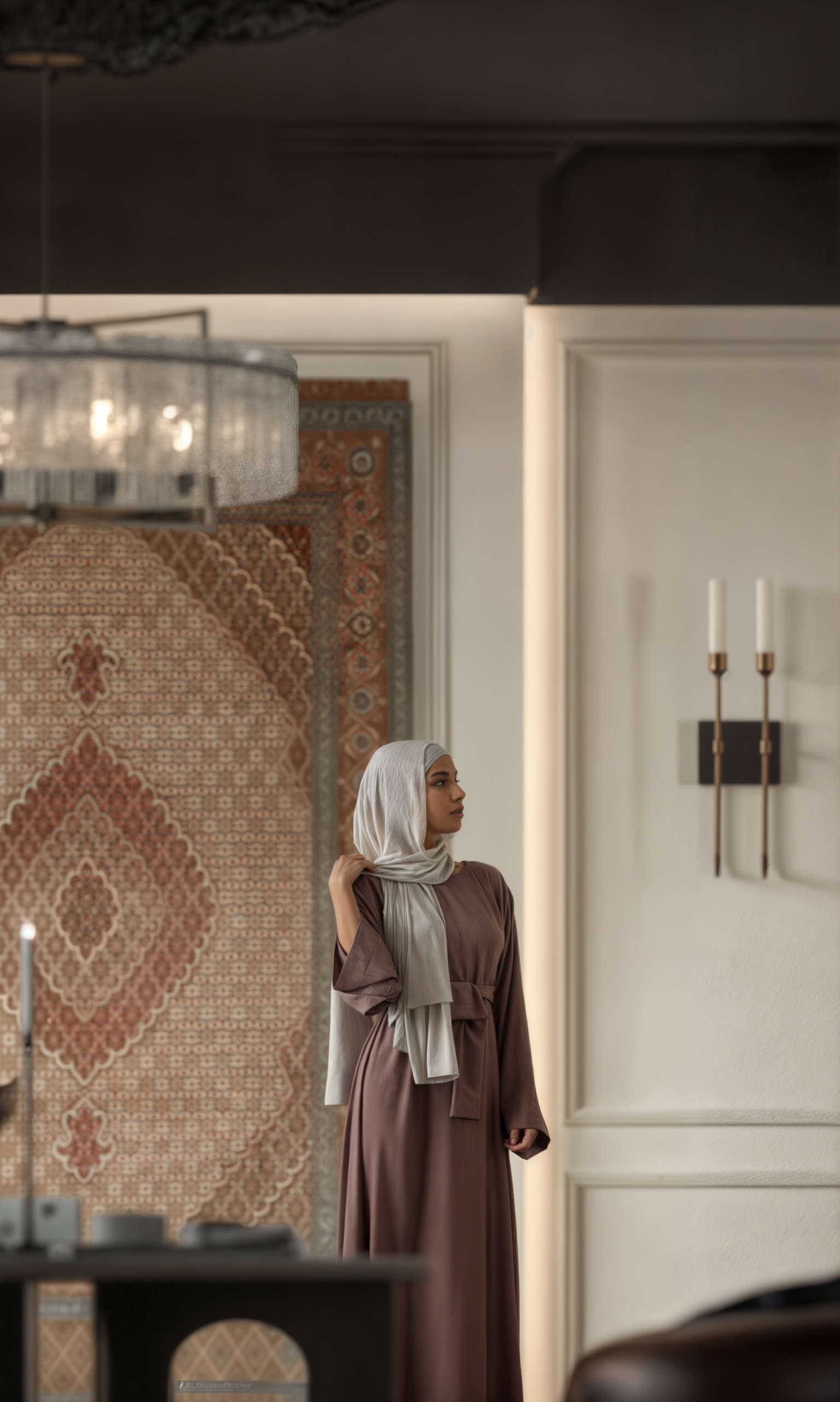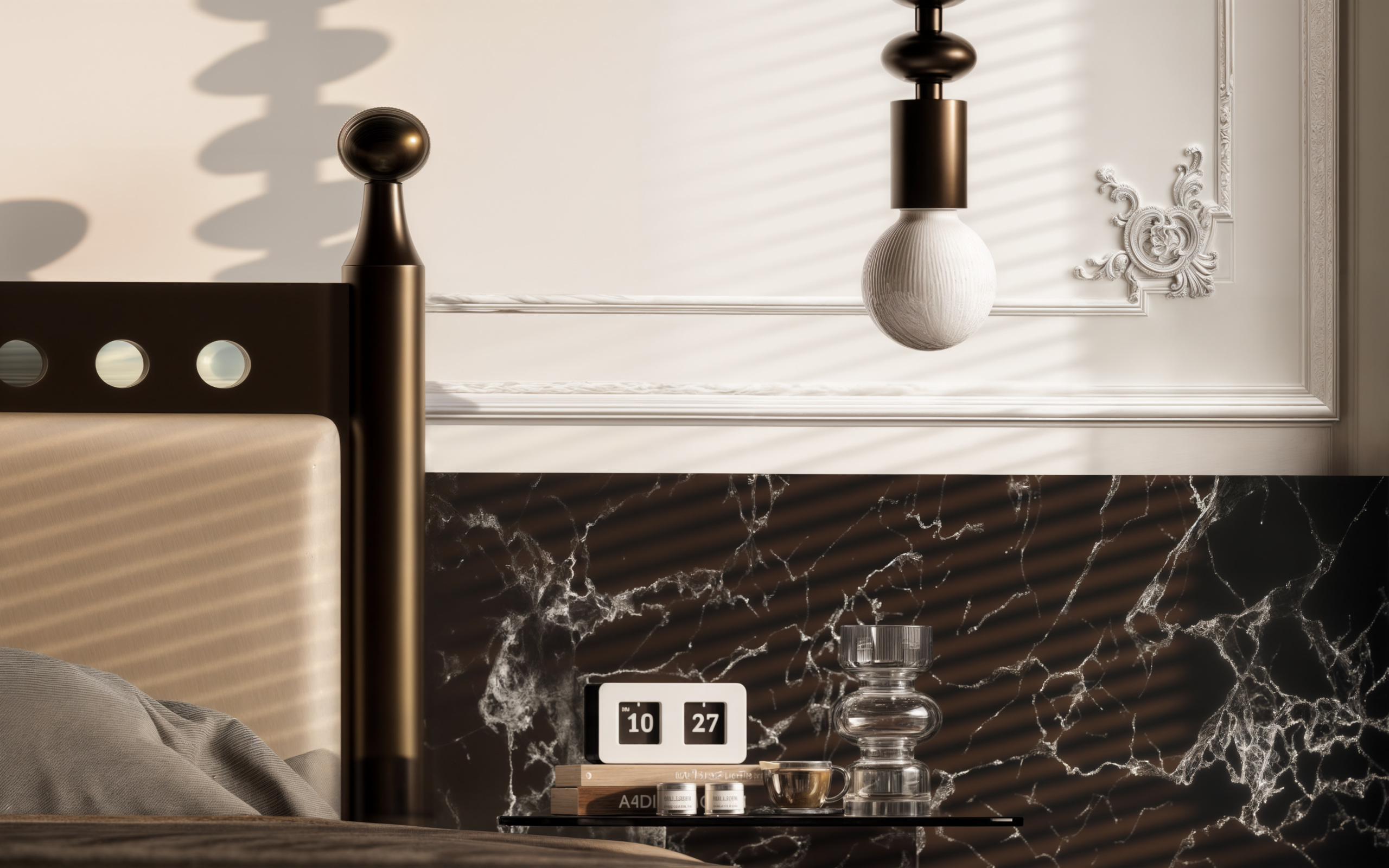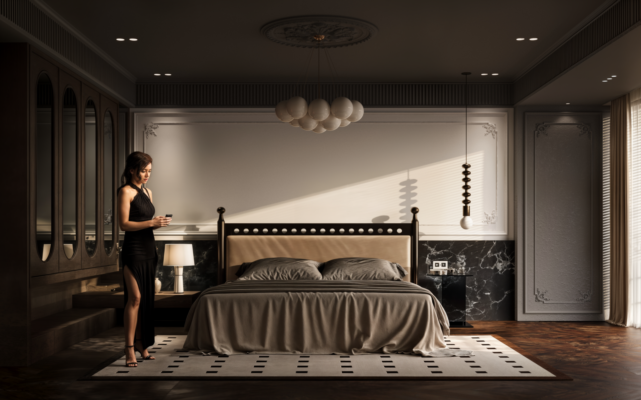 This interior design concept blends Contemporary Neo-Classical elegance with subtle Middle Eastern charm. The space features classic wall paneling, luxurious finishes like black marble and dark wood parquet, and curated modern furniture with soft curves. Elegant lighting elements—such as sculptural chandeliers and brass wall sconces—add warmth and sophistication. Rich textures, a muted earthy palette, and a statement Persian rug create a cozy yet refined ambiance. The result is a timeless, culturally inspired interior that merges tradition with modern luxury.