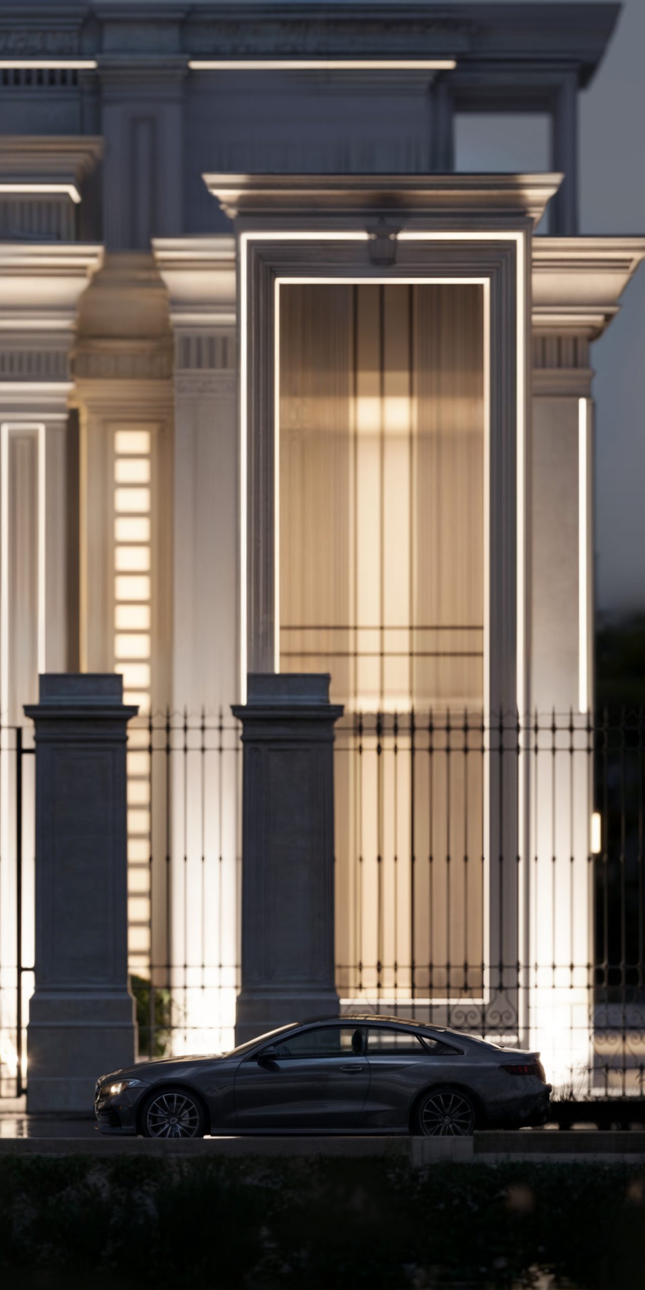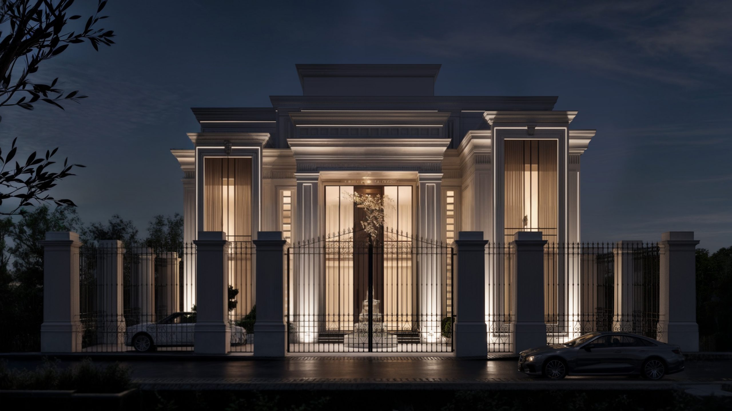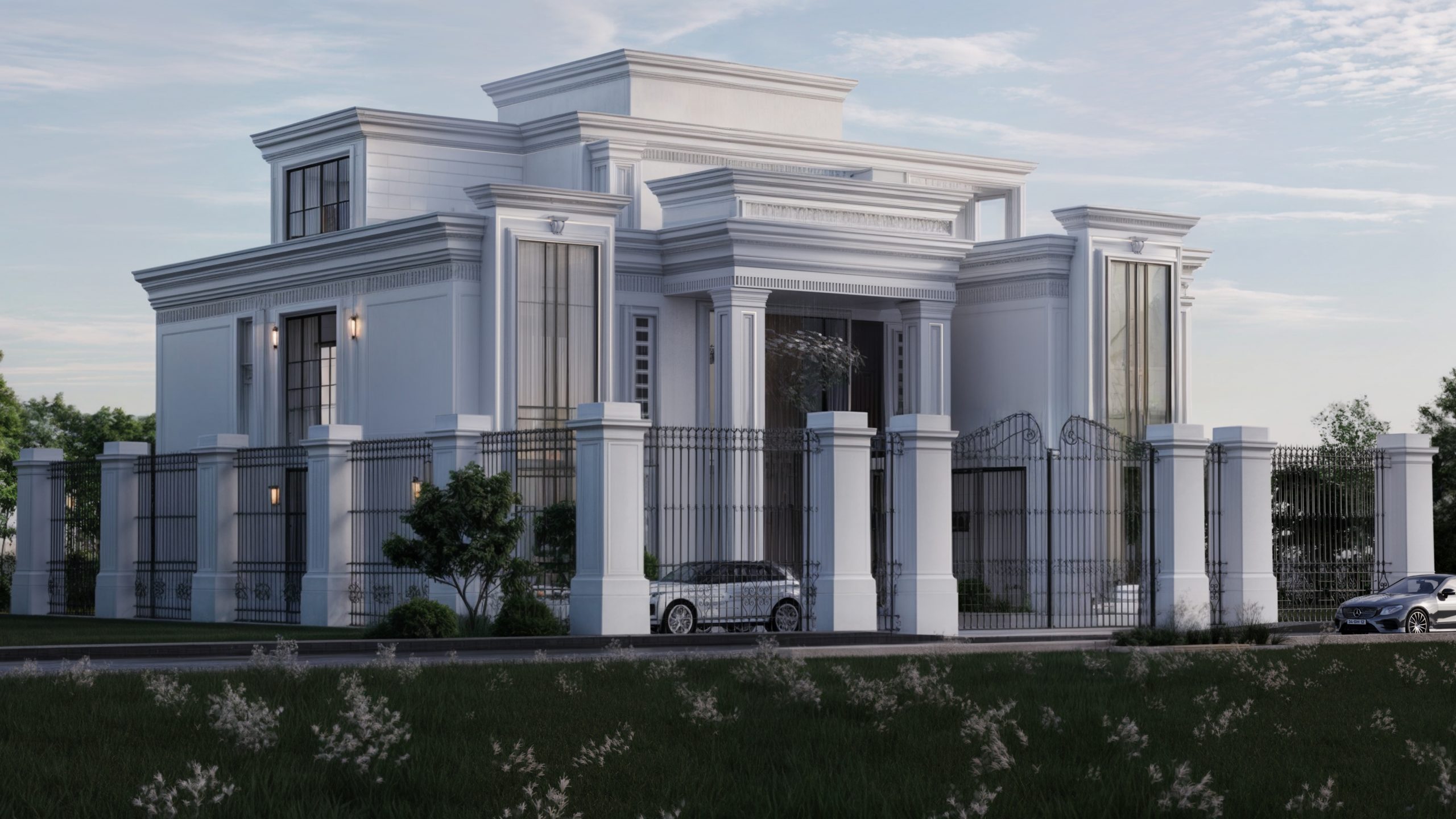 This palatial residence showcases timeless Neo-Classical grandeur. A perfectly symmetrical façade is anchored by a triple-height central portico framed with Corinthian pilasters and ornate stucco reliefs. Towering arched windows—accented by elegant wrought-iron grilles—bathe the interiors in natural light, while the crisp white stonework, layered cornices, and sculpted finials evoke refined European heritage. Slim cypress trees and a low, manicured landscape accentuate the villa’s monumental scale without distracting from its sculptural silhouette. The result is a stately home that merges classical elegance with contemporary construction for enduring luxury.
